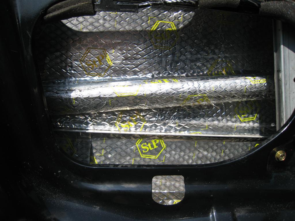 Затем укатывал СТП Голд. Отверстия внутренней филенки заделывал с помощью самодельных пластин (стекломат и эбокситка). Во первых это дает нужную жесткость, во вторых - несложно в изготовлении. В третьих малый вес и простота снятия в случае чего. Потом, прикатка СТП, прикручивание крышек на болты. Я думаю, процесс понятен по фоткам… |