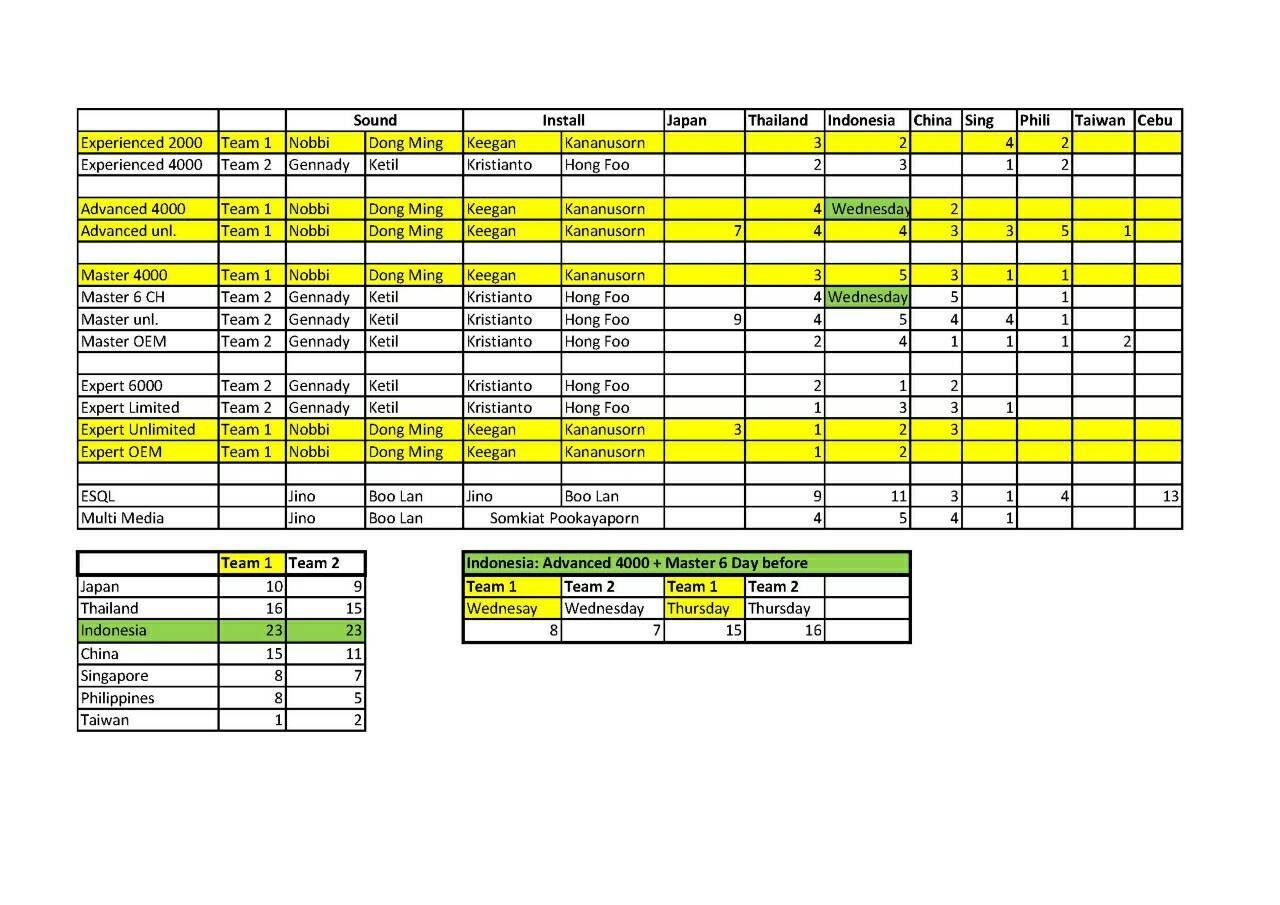Отображает количество участников по классам и странам на Финалах Азии. ESQL таки в Азии популярен и на подъёме. Ну и нагрузка на международную судейскую бригаду ... http://www.emmanet.info/emma-asia-fi...finals-judges/ ... конечно та ещё. За 2 недели (включая перелёты) 8 стран, на каждого из судей 80+ машин. |