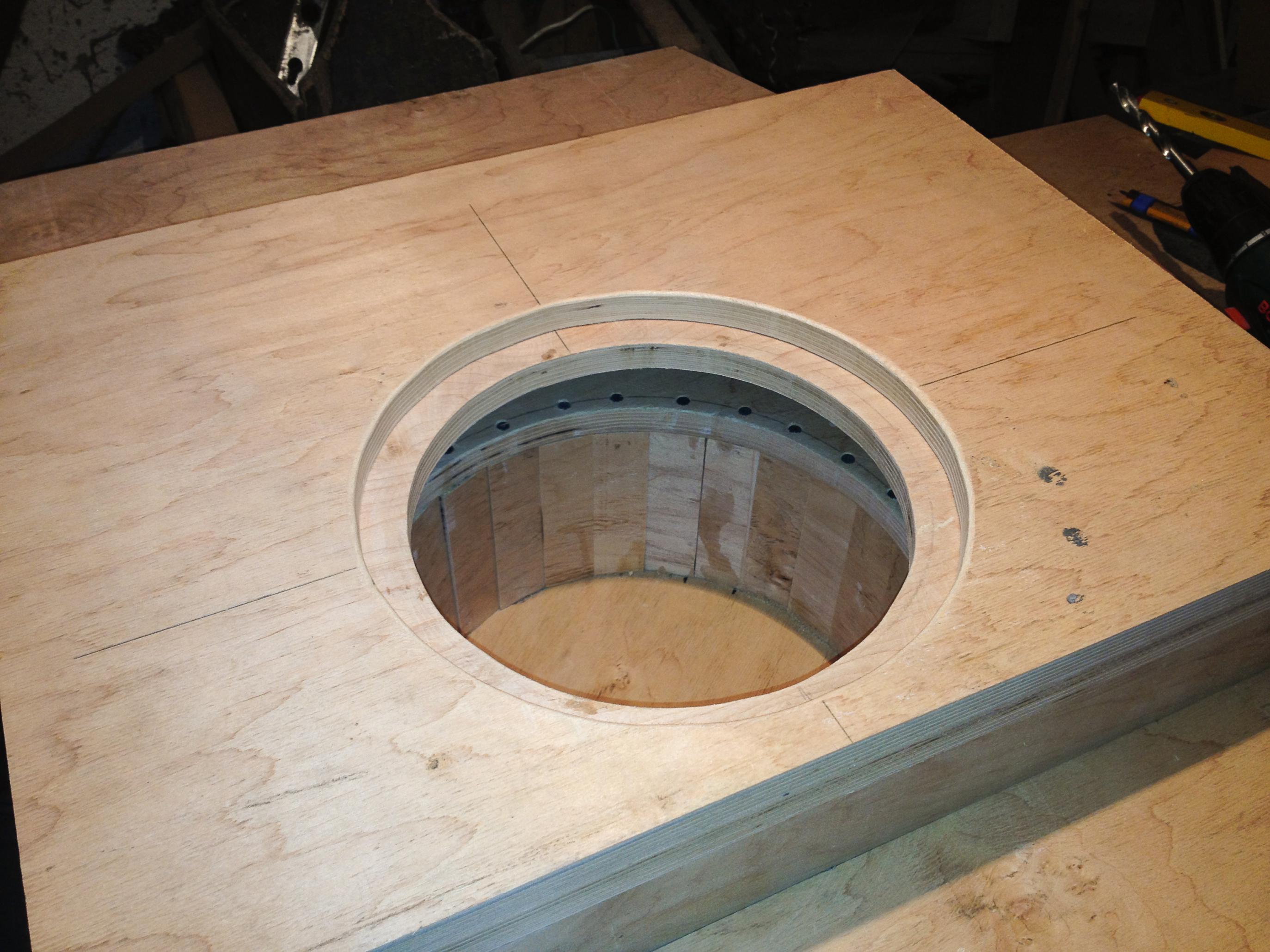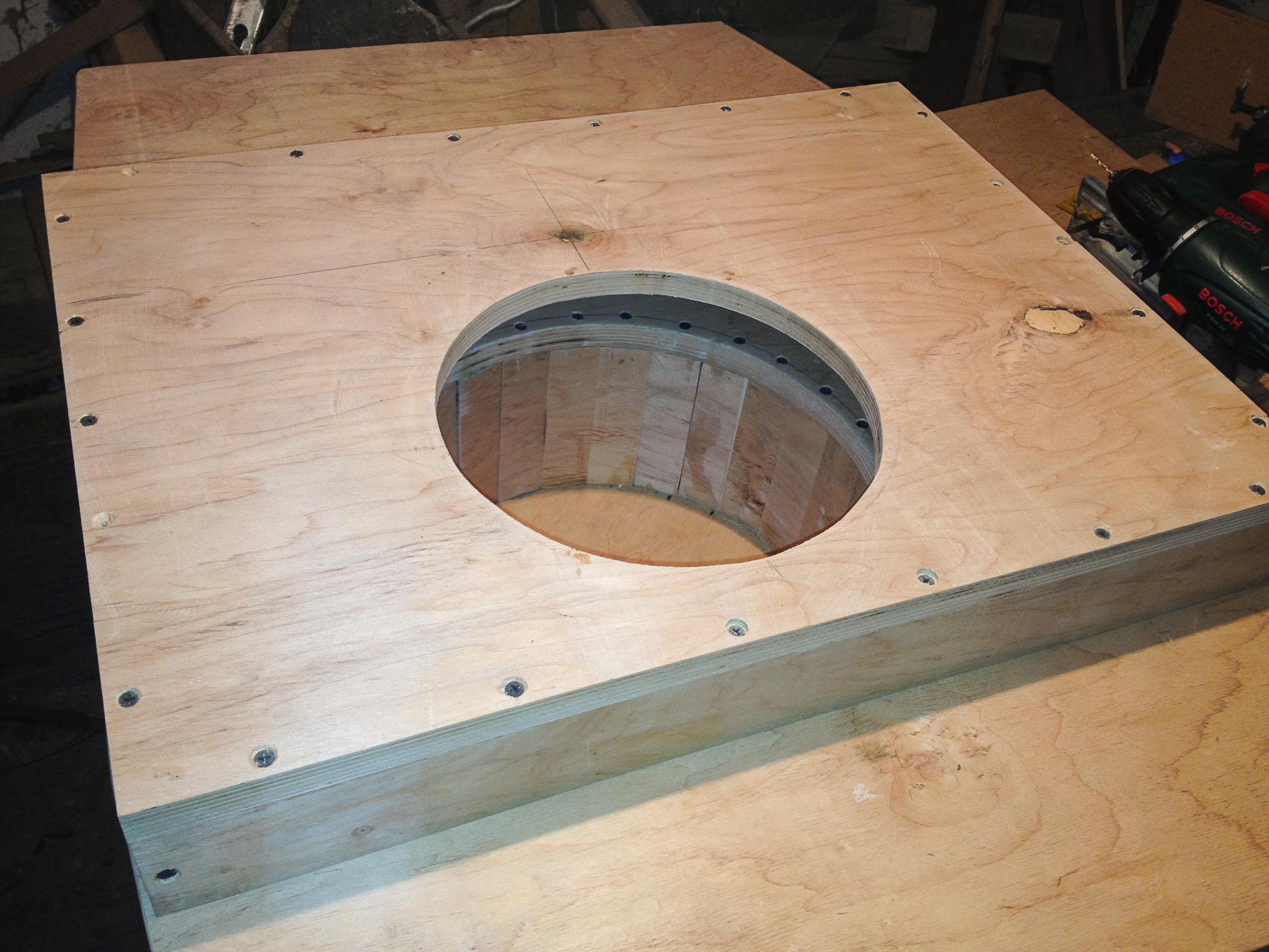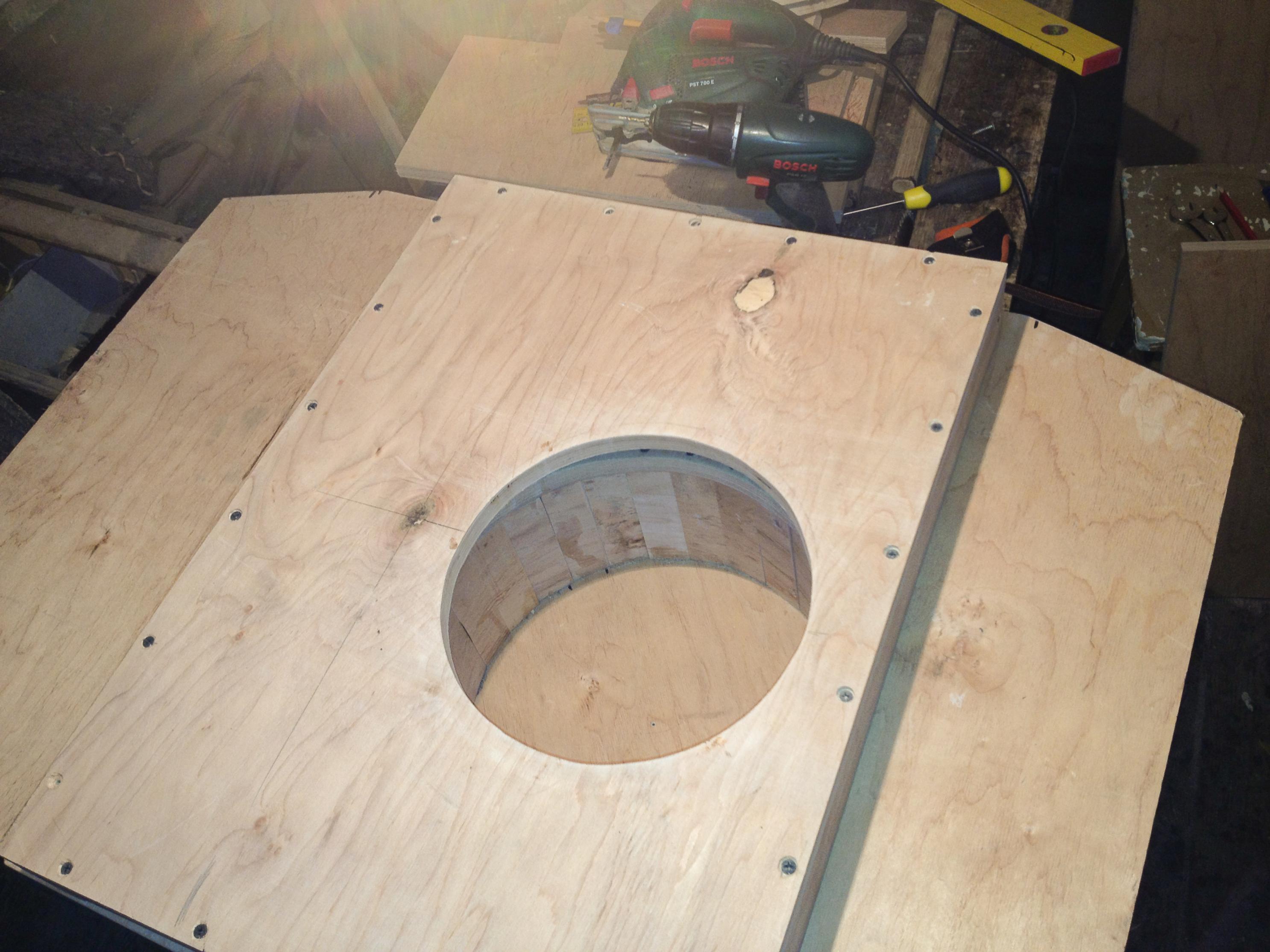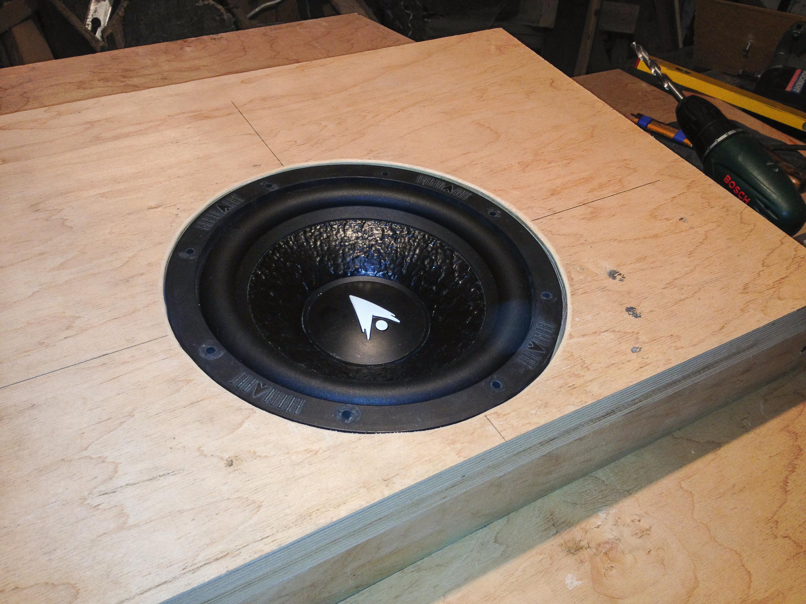Випав сонячний день і я приступив до виготовлення ящика саба з використанням ніші в запасному колесі. По замірах і обрахунках в ніші колеса спокійно набирається 10 літрів чистого об"єму. Заповнювати вирішив циліндром використовуючи фанеру 18мм, шурупи і клей ПВА. Після чого ззовні щілини були замазані сумішшю клею з дрібною як пилюка тирсою. Після висихання клею, в наступний сонячний день буду залишки "шпатлівки" зішліфовувати. Далі буде...