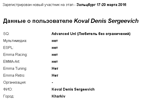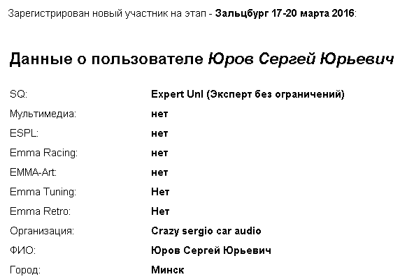 http://emma-ukraine.com/register/participant Европейский Финал пройдет в г. Зальцбурге (Австрия) 17-20 марта 2016 года. Регистрация открыта до 18:00 31 января 2016 г. Внимание! Регистрация заполняется СТРОГО на АНГЛИЙСКОМ ЯЗЫКЕ. Вниманию участников денежных классов! Участники "денежных" классов обязаны написать полное наименование моделей своей аудиосистемы с ссылкой на стоимость в базе данных ЕММА-Европа (emmanet.com). Если какой-либо модели, использованной в аудиосистеме, нет в базе данных ЕММА-Европа, участник обязан сообщить наименование модели и ссылку на сайт с рекомендованной розничной стоимостью до 25 февраля 2016 г. В противном случае участник будет дисквалифицирован и не допущен к участию в Европейском Финале. Обратите внимание, на категории SQ и ММ. В случае если в одном классе будет участвовать более 14 машин, ЕММА может решить отделить этот класс, разделив класс на две группы, и выявить лучшие 3 из каждой группы. Новый создавшийся класс будет отсужен новой судейской бригадой для определения мест с 1-го по 6-е. В качестве альтернативы, одна команда может судить все автомобили в классе в течение двух дней и лучшая шестерка может быть отсужена в третий день. Места 7, 8, 9 и т.д. будут определяться в зависимости от суммы набранных очков в первом судействе. Классы и категории Европейского финала: Качество звука: - Experienced 2000 (Новичок 2000) - Experienced 4000 (Новичок 4000) - Advanced 4000 (Любитель 4000) - Advanced Unl (Любитель без ограничений) - Master OEM (Мастер ОЕМ) - Master 4000 (Мастер 4000) - Master 6 ch (Мастер 6) - Master Unl (Мастер без ограничений) - Expert 6000 (Эксперт 6000) - Expert Limited (Эксперт) - Expert Unlimited (Эксперт без ограничений) Мультимедиа: - Experienced (Новичок) - Master (Мастер) - Expert (Эксперт) ESPL: - Advanced Trunk 2W (Любитель багажник 2) - Advanced Trunk 4W (Любитель багажник 4) - Advanced Trunk Unlimited (Любитель багажник без ограничений) - Master B Unlimited (Мастер стойка В) - Master W Unlimited (Мастер стена) - ESPL Expert Unlimited (Эксперт) ЕММА Racing: - Advanced (Любитель) - Master (Мастер) ESQL: - Master (Мастер) Все вопросы по регистрации на Еврофинал можно задать по телефону 80505150947 или по e-mail: boris@emma-ukraine.com Последний раз редактировалось Директор Луны; 21.11.2015 в 13:04. |
