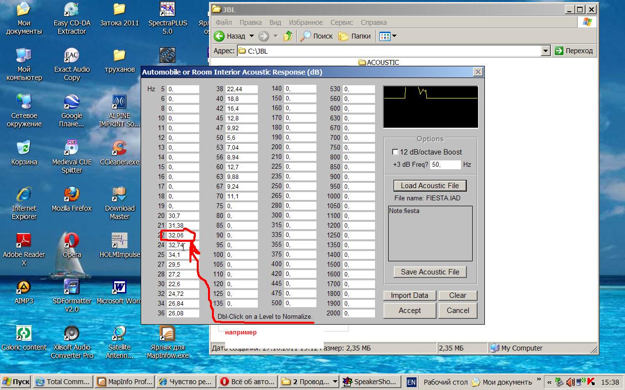 После внесения результатов и создания файла влияния салона , возник вопрос к какому уровню нормализовать данные, а то графики ачх в jbl ss выглядят нереально. Кто хочет, попробуйте. Распакуйте файл и в jbl ss выберете путь Edit---Interior Acoustics---Load Acoustic File---место хранения распакованого файла---ок Нормализация делается двойным кликом на выбранном уровне |