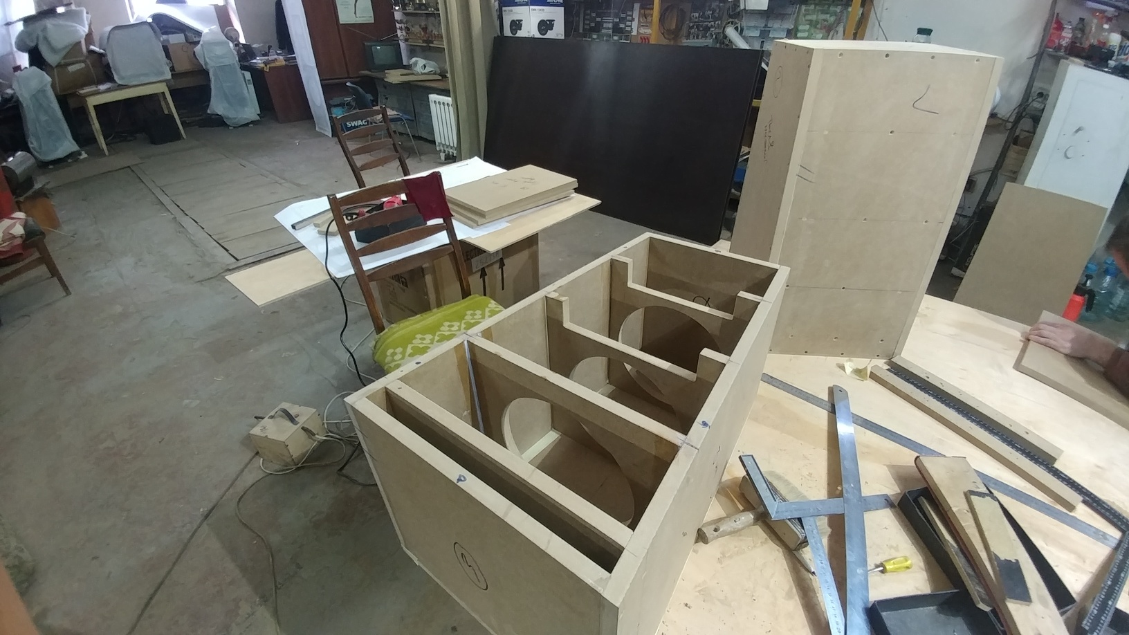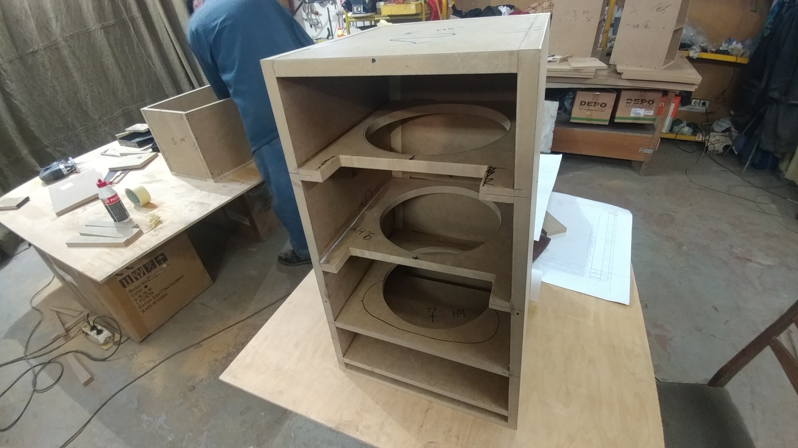 День, 1-й...... Начали сборку корпусов , НЧ боксы и ВЧ /СЧ боксы... В исполнении близком к реальным размерам выглядят хорошо...нормальные пропорции, комфортная для прослушивания высота и т.д. |