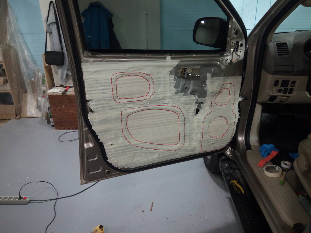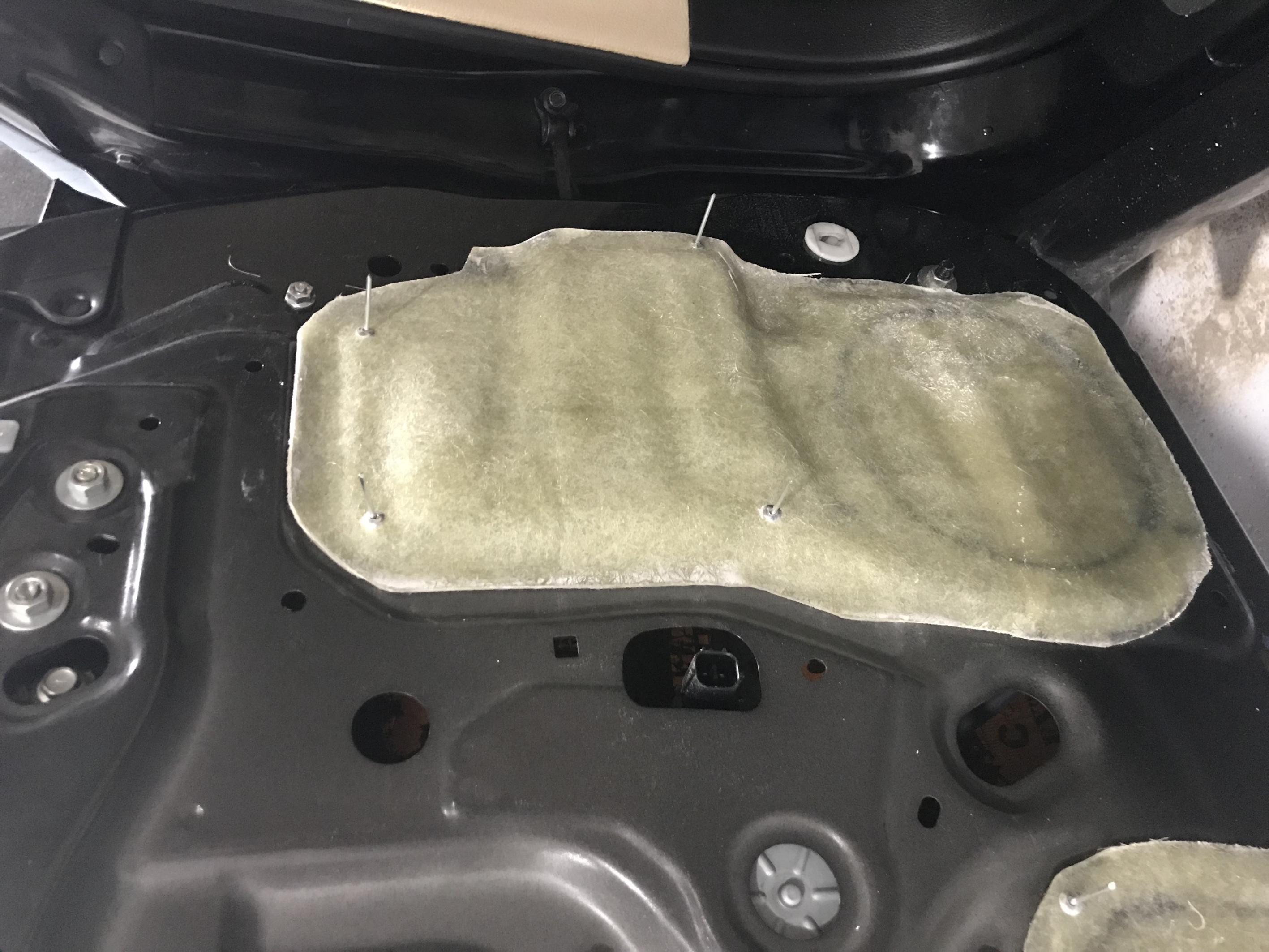 После установки заглушек, филенка полностью закатывается в виброизоляцию. Это вид готовой двери перед установкой карты. Посадочное место для мидбасса имеет максимальную жесткость, что очень сильно влияет на качество звука.