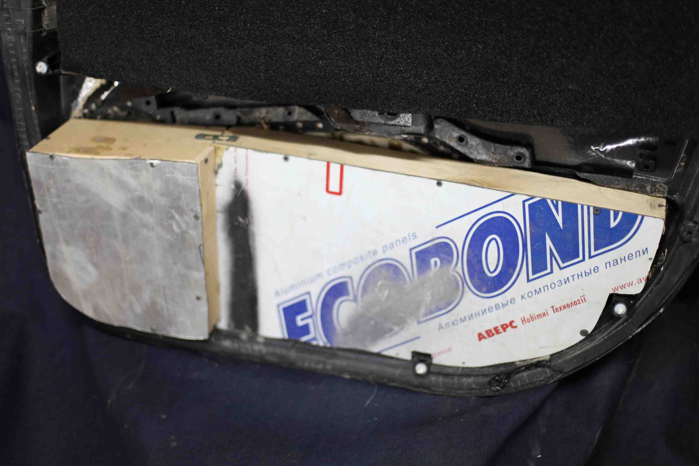 Что бы получился нужный нам обьём для мидов, с приличным растоянием за магнитной системой, пришлось поработать лобзиком. Вырезав нижнею часть дверной карты пришлось решать вопрос жосткости вот так: