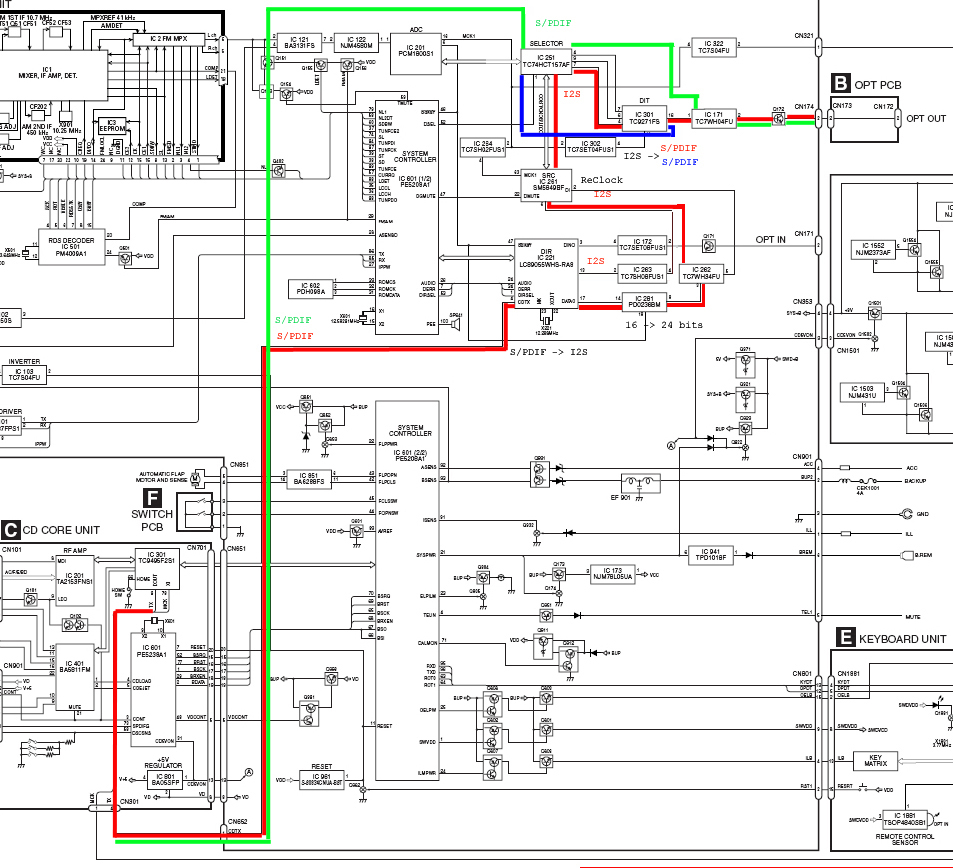 Когда я изучил схему П9, и посмотрел как формируется сигнал для передачи на внешний проц., цензурных слов в моём словарном запасе - не осталось. Сигнал с СД-привода, в уже готовом для передачи на проц. S/PDIF формате, преобразуется в I2S. Затем этот сигнал проходит через улучшайзер, преобразователь частоты дискретизации и разрядности с 16 на 24 бита. Затем этот сигнал опять преобразуют в S/PDIF (уже от другого мастерклока) и только потом подают на оптический выход. Разумеется ни о каком качестве звука, после такого издевательства над сигналом, говорить не приходится. Короче нужно лечить.Самый простой вариант лечения - это подать сигнал с СД-привода прямо на опто-передатчик. Но тогда мы останемся без радио. Спасибо Пионеру, на плате есть цифровой коммутатор (TC74HCT157AF), в котором есть один свободный блок коммутации, да ещё и управление этого коммутатора делает переключение между радио и СД. Входы коммутатора заведены на землю, поэтому ножки микросхемы 13 и 14 нужно отпаять от платы и отогнуть. К 14 ноге подпаиваем выход цифры из СД-привода. К 13 ноге выход с преобразователя в S/PDIF (TC9271FS), соответственно убираем резистор (R301) с этого выхода, чтобы оторвать его от выхода на оптику. К 12 ноге подпаиваем резистор (R301) и этот резистор подпаиваем к одному из его (резистора) бывших контактов, который идет на опто-передатчик.И ВСЁ! Мы получили качественный выход на процессор и при этом сохранили возможность слушать радио. Правда в такой схеме не работает оптический вход П9, это тоже решаемо одной дополнительной микросхемой логики "И"/"ИЛИ" (какой именно зависит от состояния неактивного сигнала: если неактивный сигнал "0", тогда "ИЛИ", а если "1", тогда "И"). |