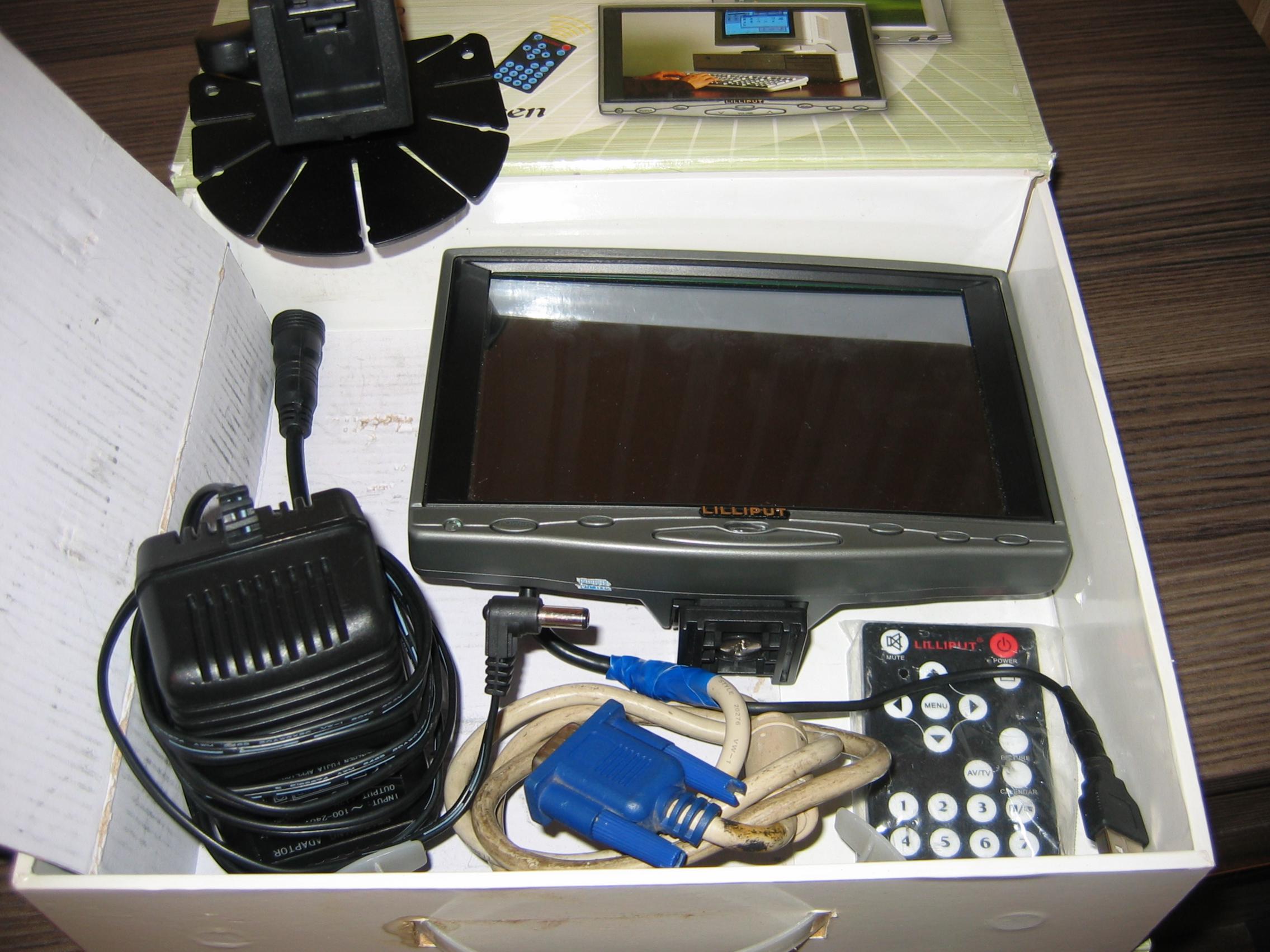 В комплекте монитор, пульт, крепление, адаптер 220 вольт и коробка. Отсутствуют шнуры vga, usb, rca и питание в прикуриватель. Vga и USB были прикручены неродные. Монитор разбирался 1 раз, чтобы прозвонить контакты VGA USB.