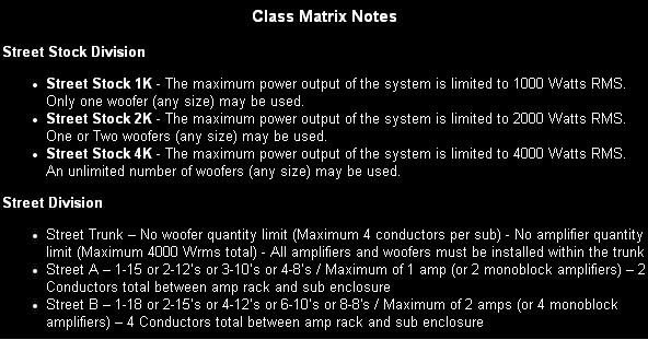 Street B - количество сабвуферов 1-8*(1-18 или 2-15 или 4-12-х или 6-10-х или 8-8),расположение в пределах багажника, 2 АКБ объемом до 800 кубических дюймов каждая, количество и емкость конденсатора 2F,максимальное количество усилителей 2 (4 мостом),максимальное количество проводников 4 всего.
