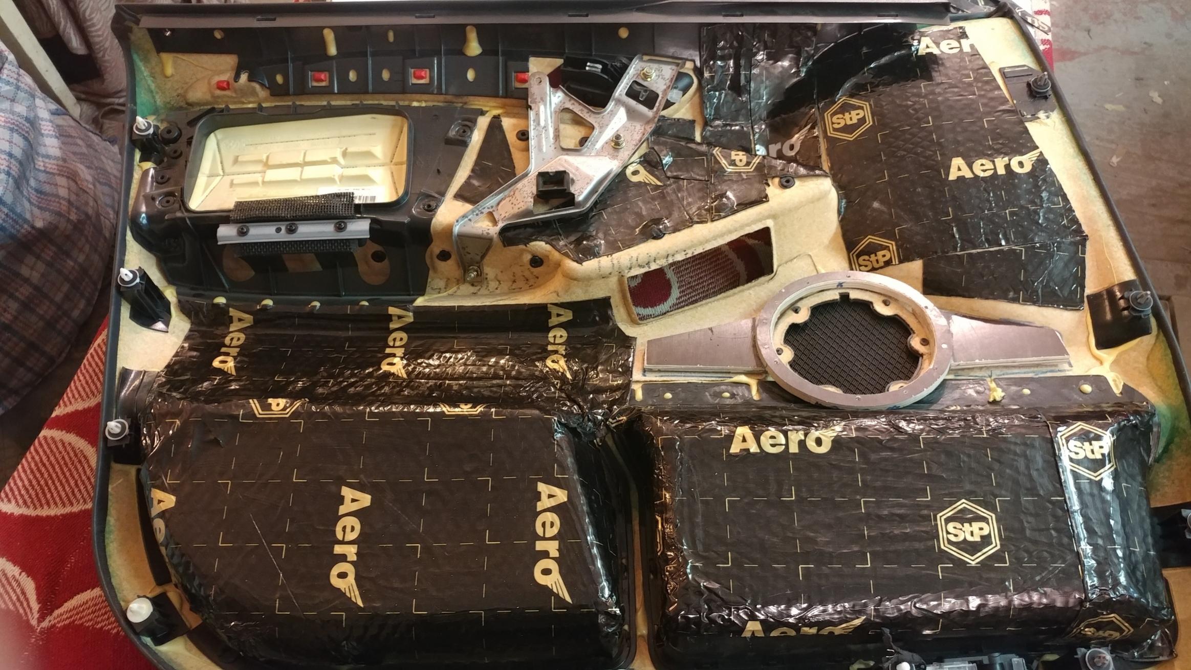 Звук в авто не меняли ( по словам клиента в системе установлено 19 динамиков, от кутюрье Bang & Olufsen ), но делаяя шумовиброизоляцию салона улыбнулись, увидя ОЧЕНЬ оригинальную конструкцию мидбаса))))