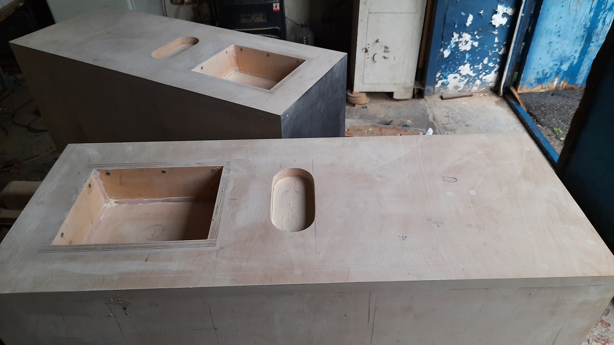 Был изготовлен мощный корпус предельно малого обьема ( вдруг пользователь пожелает разместить АС на столе, возле компа).После моделирования и прослушивания с процем опрелились : более приятно и открыто СЧ звучит в варианте фриэйр.Условно ограничивающая обьем СЧ труба выведена на заднюю стенку АС и для выравнивания АЧХ выложена по стенкам шерстью Monacor ( на фото видно, как выбирались варианты заполнения ). Фильтры : НЧ и СЧ свели примерно на 400..500 Гц, при этом СЧ сверху ничем не ограничили, играет в полную полосу с естественным затуханием ( на слух показался лучшим вариантом, впрочем , как и в авто). ВЧ снизу подрезали HP фильтром, примерно 5..5,5 кГц. Отделка, как обычно 2х цветный итальянский шпон, обработанный датским маслом. Внешне получились достаточно компактными и симпатичными,