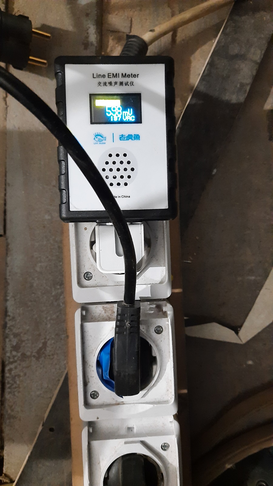 Фокусировкиа и др. ) .Под рукой оказался прибор для измерения ВЧ помех в сети. Замеряли в нашем боксе до и после блока питания. И визуальный ( см.фото 598 мВ и 44 мВ) и звуковой ( при больших помехах прибор громче…верещит))) результат налицо |