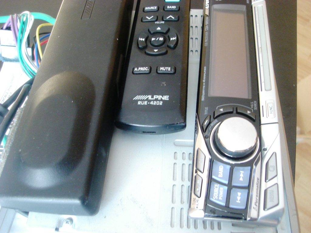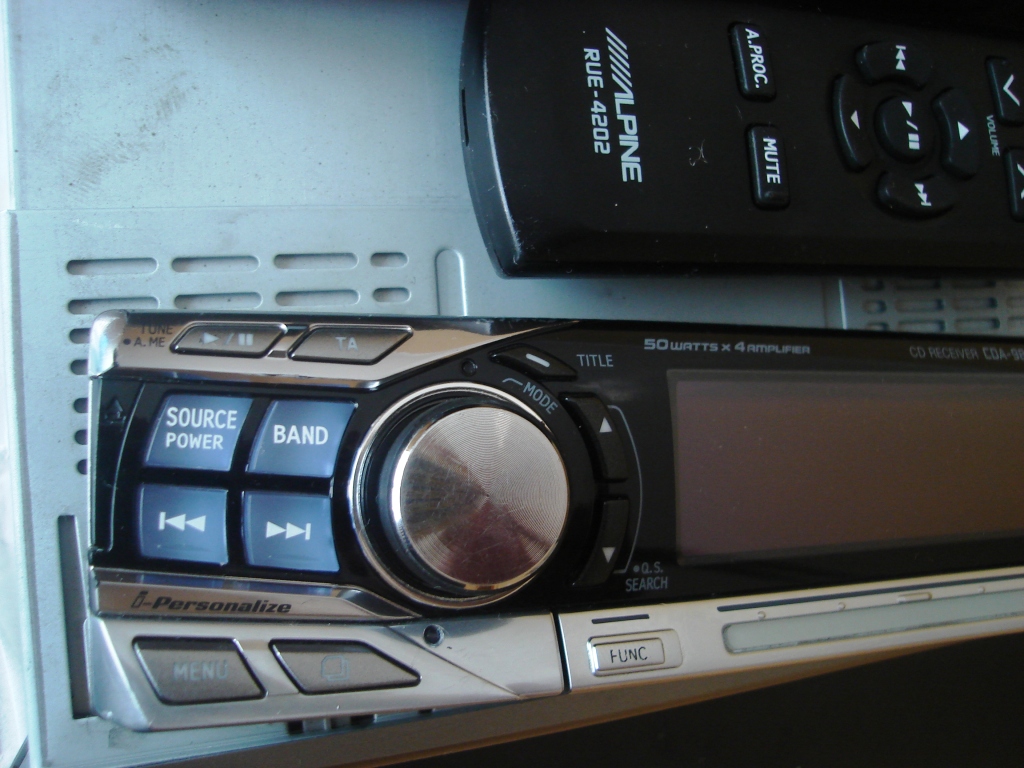 Alpine CDA-9855R, в хорошем состоянии,полный комплект: голова, шахта, рамка,провода, футляр, пульт, инструкция, немного затерта кнопка FUNC , и есть потертости в левом верхнем углу , работает без проблем, диски читает нормально, панель работает нормально.