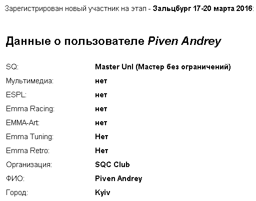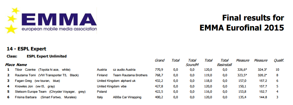 http://emma-ukraine.com/register/participant Европейский Финал пройдет в г. Зальцбурге (Австрия) 17-20 марта 2016 года. Вложение 57862 Регистрация открыта до 18:00 31 января 2016 г. Внимание! Регистрация заполняется СТРОГО на АНГЛИЙСКОМ ЯЗЫКЕ. Вниманию участников денежных классов! Участники "денежных" классов обязаны написать полное наименование моделей своей аудиосистемы с ссылкой на стоимость в базе данных ЕММА-Европа (emmanet.com). Если какой-либо модели, использованной в аудиосистеме, нет в базе данных ЕММА-Европа, участник обязан сообщить наименование модели и ссылку на сайт с рекомендованной розничной стоимостью до 25 февраля 2016 г. В противном случае участник будет дисквалифицирован и не допущен к участию в Европейском Финале. Обратите внимание, на категории SQ и ММ. В случае если в одном классе будет участвовать более 14 машин, ЕММА может решить отделить этот класс, разделив класс на две группы, и выявить лучшие 3 из каждой группы. Новый создавшийся класс будет отсужен новой судейской бригадой для определения мест с 1-го по 6-е. В качестве альтернативы, одна команда может судить все автомобили в классе в течение двух дней и лучшая шестерка может быть отсужена в третий день. Места 7, 8, 9 и т.д. будут определяться в зависимости от суммы набранных очков в первом судействе. Классы и категории Европейского финала: Качество звука: - Experienced 2000 (Новичок 2000) - Experienced 4000 (Новичок 4000) - Advanced 4000 (Любитель 4000) - Advanced Unl (Любитель без ограничений) - Master OEM (Мастер ОЕМ) - Master 4000 (Мастер 4000) - Master 6 ch (Мастер 6) - Master Unl (Мастер без ограничений) - Expert 6000 (Эксперт 6000) - Expert Limited (Эксперт) - Expert Unlimited (Эксперт без ограничений) Мультимедиа: - Experienced (Новичок) - Master (Мастер) - Expert (Эксперт) ESPL: - Advanced Trunk 2W (Любитель багажник 2) - Advanced Trunk 4W (Любитель багажник 4) - Advanced Trunk Unlimited (Любитель багажник без ограничений) - Master B Unlimited (Мастер стойка В) - Master W Unlimited (Мастер стена) - ESPL Expert Unlimited (Эксперт) ЕММА Racing: - Advanced (Любитель) - Master (Мастер) ESQL: - Master (Мастер) Все вопросы по регистрации на Еврофинал можно задать по телефону 80505150947 или по e-mail: boris@emma-ukraine.com |