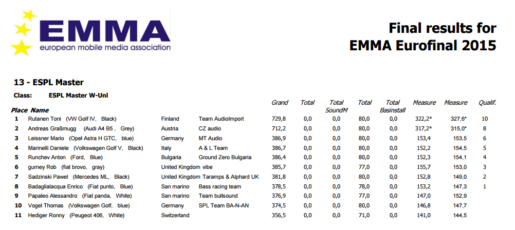 На Еврофинале были Финалы во второй день. По две лучших машины из классов по результатам первого дня (замеры). Это нормальная практика для Евро Те резы которые со звёздочками - это финалисты. 300+ это сумма замеров за первый день и соответственно за Финал второго дня. Слева открытые двери, справа закрытые. Остальные резы это открытые (слева, на открытых дверях был первый замер) и закрытые (справа, второй замер). Квалификационные очки никак не считаются, просто никому не нужные цифры в программе |