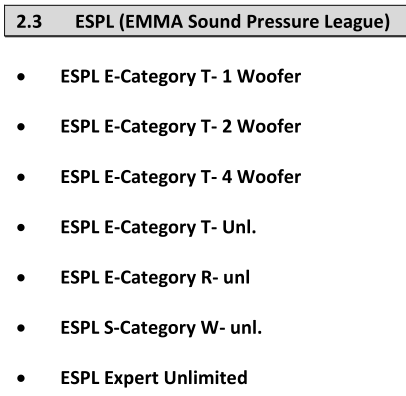 Ну, во-первых, значительное сокращение классов и появление новых. Если вкратце ... SQ и ММ: E - Class (Entry)(Новичок) До 3000 € включительно Без ограничений Условия соответствия классу: - не для спонсорских машин - не для профессионалов и судей - запрещены модификации активного оборудования - без ограничений в установке оборудования В Е-классе участник имеет право выступать только один сезон S - Class (skilled)(Любитель) OEM До 4000 € включительно Без ограничений Multi Media 2.1 Условия соответствия классу: - не для спонсорских машин - не для профессионалов и судей - запрещены модификации активного оборудования - без ограничений в установке оборудования (за исключением ОЕМ) M - Class (Master)(Мастер) OEM До 6000 € включительно Без ограничений Multi-Media Master 5.1 - без ограничений в установке оборудования (за исключением ОЕМ) X - Class (Expert)(Эксперт) Один класс Бонусные баллы ограничены 20-тью. ESPL, ESQL, EMMA Racing: ESPL T- 1 Woofer (багажник 1 саб) ESPL T- 2 Woofer (багажник 2 саба) ESPL T- 4 Woofer (багажник 4 саба) ESPL T- Unl. (багажник без ограничений) ESPL W- unl. (салон??? стена??? - пока непонятно, будем выяснять) ESPL R- unl (????????) Racing Stock (сток) Racing Custom (кастом) ESQL R-Class ESQL Expert Во-вторых, намечаются значительные послабления в судействе и требованиям к инсталляции. Но об этом чуть позже ... пс. Из того, что наверняка понравится ESPL-щикам в первую очередь - увеличены номиналы предохранителей относительно сечения провода. Например, раньше на 50 квадратов допускался максимальный пред 200 А, то теперь допускается 250 А. 0,5mm² - 10 Ampere 1,0mm² - 15 Ampere 1,5mm² - 20 Ampere 2,5mm² - 20 Ampere 4,0mm² - 30 Ampere 6,0mm² - 50 Ampere 10mm² - 60 Ampere 16mm² - 100 Ampere 25mm² - 125 Ampere 35mm² - 175 Ampere 50mm² - 250 Ampere 70mm² - 300 Ampere http://www.emmanet.info/download/EMM...l%202016V1.pdf ппс. Далі буде ... |