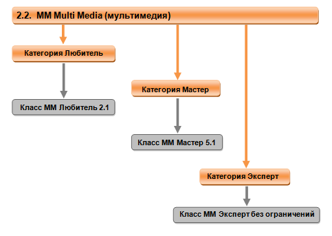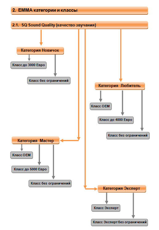 Есть Любитель 2.1, Мастер 5.1 и Эксперт 5.1. То, что ты говоришь про конкуренцию - там в Любителях 2.1 есть одно небольшое, но важное ограничение ;) ...... запрещено модифицированное и самостоятельно изготовленное активное оборудование. пс. Потерпи, через полчаса выложу полную классификацию и соответствие. |