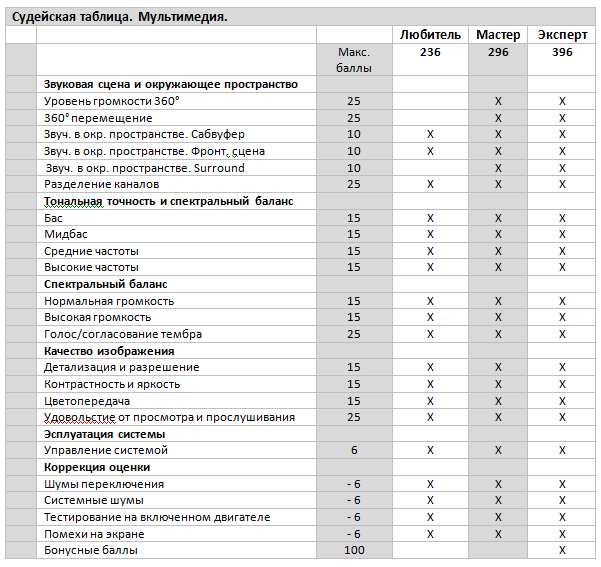 По классам ... SQ E - Class (Entry)(Новичок) До 3000 € включительно Новичок без ограничений S - Class (skilled)(Любитель) OEM До 4000 € включительно Любитель без ограничений M - Class (Master)(Мастер) OEM До 6000 € включительно Мастер без ограничений X - Class (Expert)(Эксперт) Эксперт (15 бонусов) Эксперт без ограничений (100 бонусов) Мультимедия S - Class (skilled)(Любитель) Multi Media 2.1 M - Class (Master)(Мастер) Multi-Media Master 5.1 X - Class (Expert)(Эксперт) Эксперт без ограничений (15 бонусов) Вложение 58526 |
