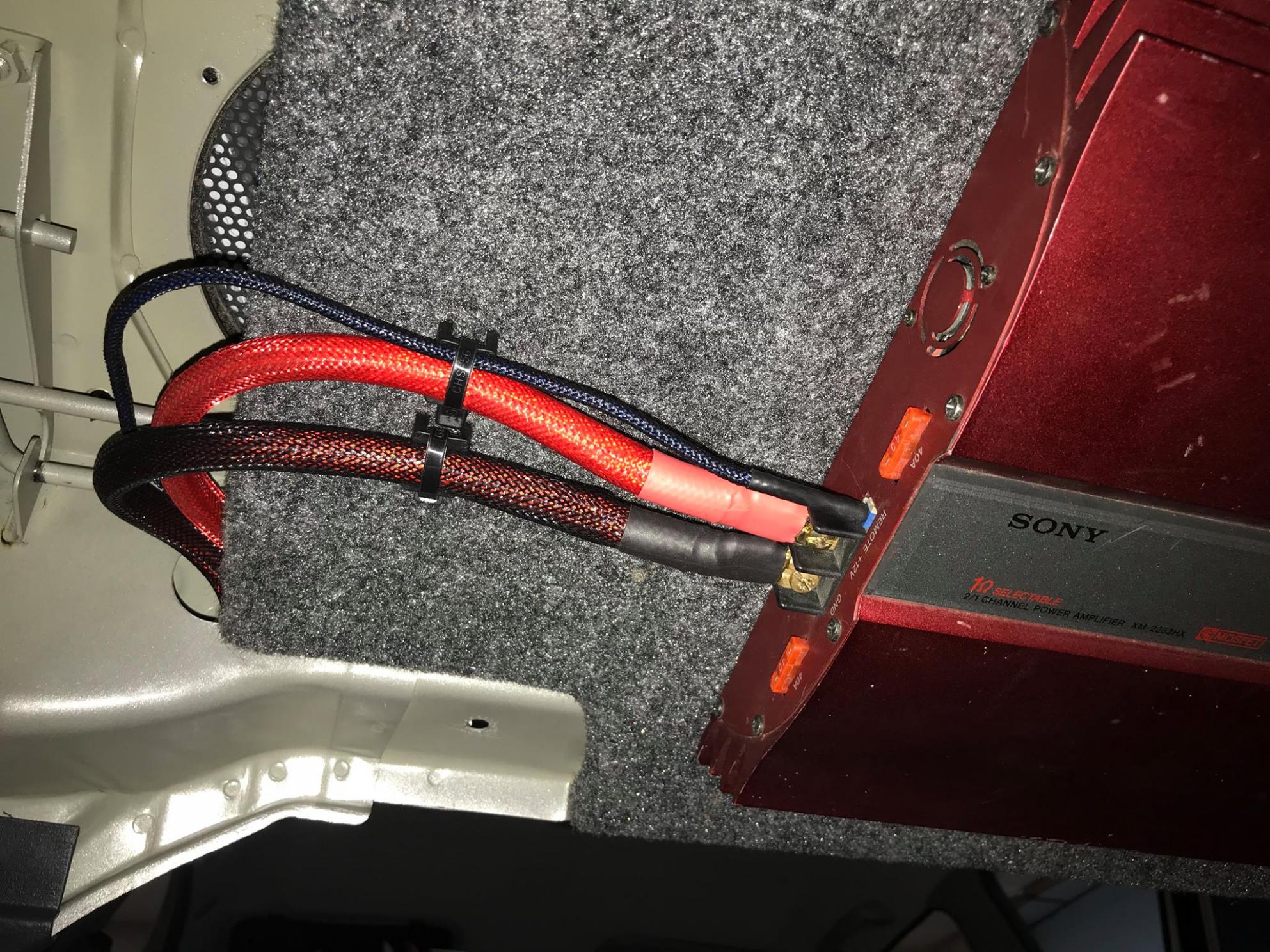 После обесшумки пола и багажника настала очередь проводки. Силовой кабель плюс и минус 35кв.мм в "змеиной коже", акустический и межблочный Straight Wire также в защите закреплен по всему пути прохождения из торпедо в багажник.