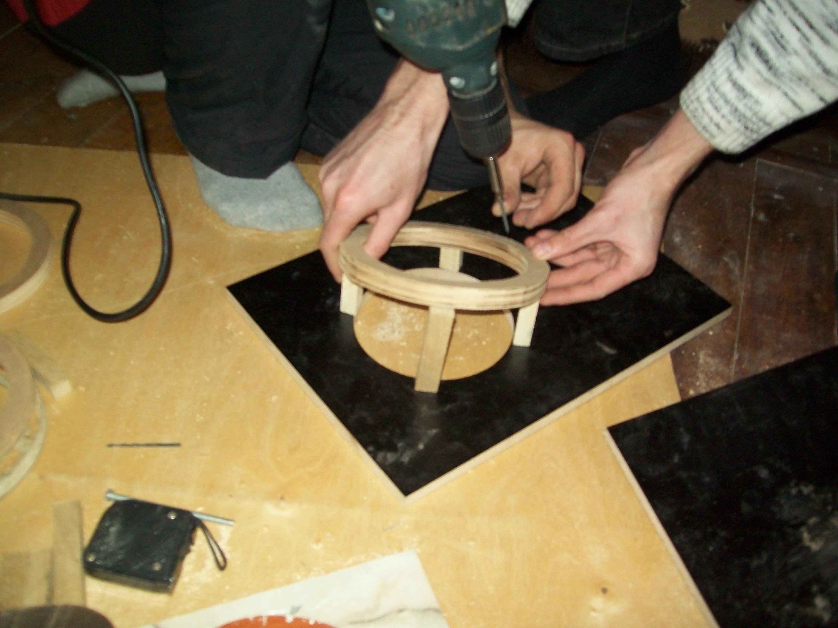 ) подіуми з доворотом по фотографіям видно як це все робилося: до листа фанери з отвором прикрутив на шурупи 4 планочки різних розмірів, для того щоб динамік дивився на КПП, до них прикрутив кольцо з фанери, запінив піною, піна висохла обрізав лишнє, надів колготку і помазав епоксидним клеєм для прочності пізніше перешпаклював автомобільною шпаклівкою.