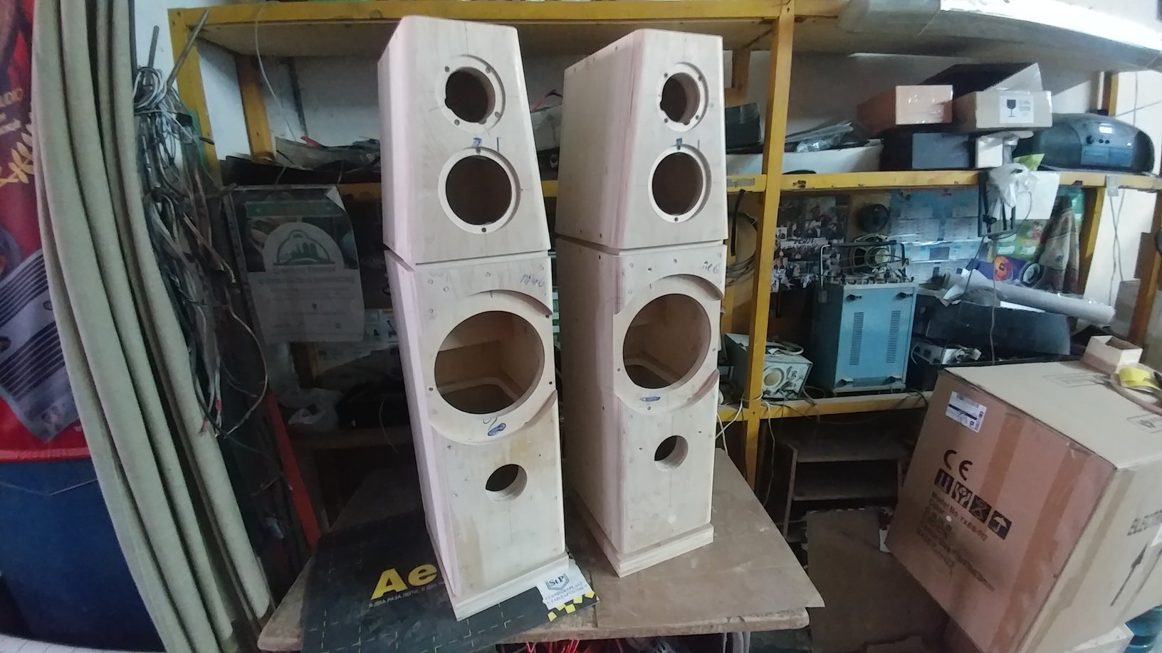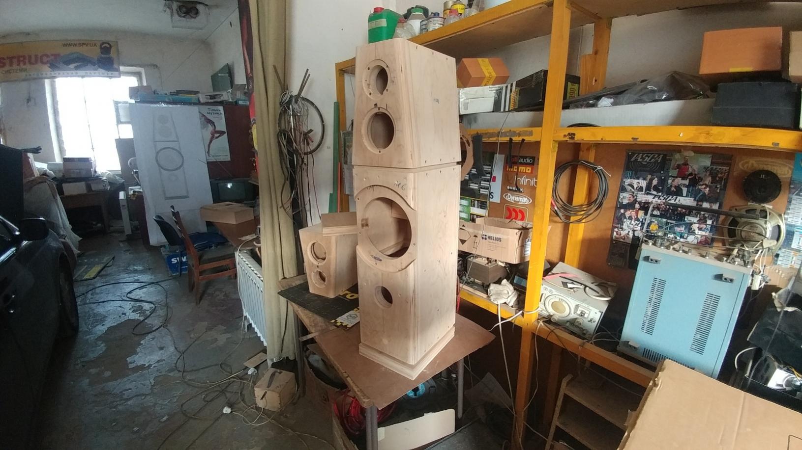 Собирали нижние корпуса, устанавливали ребра жесткости, лицевые панели, фрезеровали грани и места под установку НЧ динамиков, шлифовали поверхности боксов.... Потом сложили все в кучу ...без закрепления....ожидаемо симпатично получается