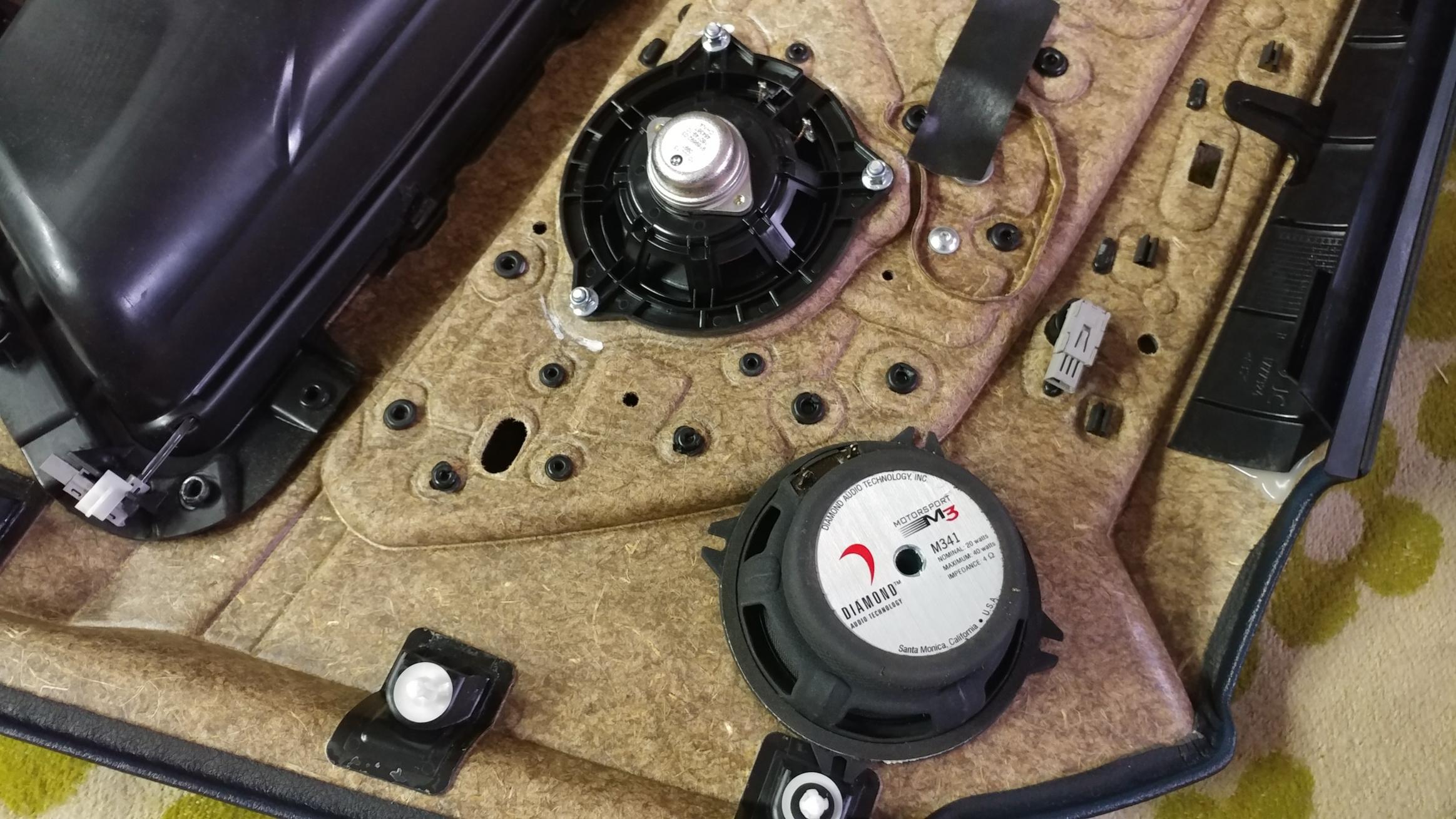 Итак, новый проект...BMW 5, кузов F5...апгрейд штатной аудиосистемы. Сняли карты дверей и стало понятно со среднечастотником...он в данном случае стоит одинешенько в карте. С заменой определились, это динамик НЧ/СЧ из комплекта Diamond Audio M341 motosport , учитывая, что мидбасы расположены штатно под сидением и не играют выше 200 гц