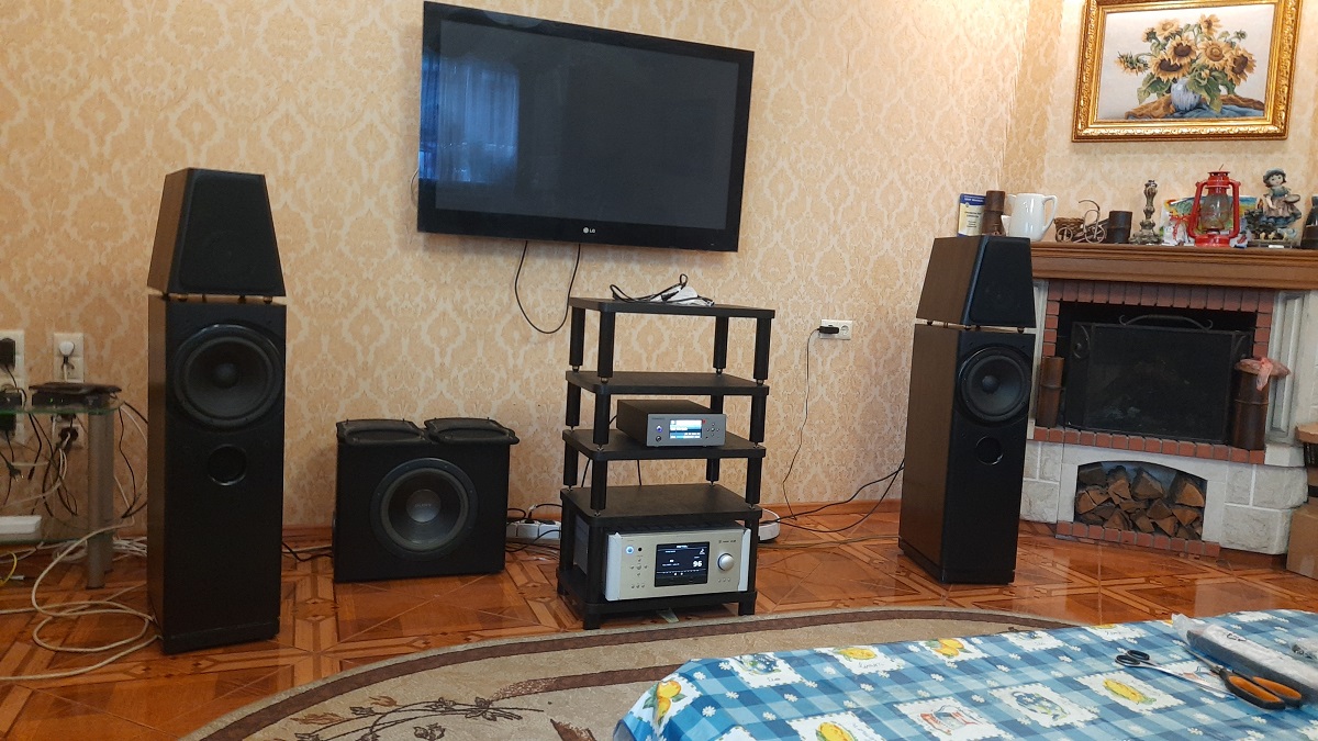 корпуса оказалось недостаточно для глубокого баса. Заменили на SB Acoustic со встроенным усилителем с ЭМОС. Результат получили впечатляющий: очень ровная АЧХ в нижнем диапазоне от 20 Гц, возможность плавной регулировки частоты среза и стыковки с СЧ головкой, регулировки уровня, Фактически в определенных пределах это помогало подстроиться под акустику помещения. Кстати, пришлось немного наслух подкорректировать фильтры пасс кроссов на СЧ и ВЧ диапазонах. Были определенные волнения , как СЧ /ВЧ секция АС , работающая от каналов ресивера Rotel, сыграется с НЧ секцией АС, работающей от усилителя D-Class с ЭМОС ( по скорости, тембру звучания и др…). Но все состыковалось без проблем и наилучшим образом. У себя в боксе определились с выставлением и ориентацией АС, окончательным значением фильтров пасскроссов. Оптимальным расстоянием до точки прослушивания. Смонтировали систему у заказчика. И тут обнаружились вопросы : диван ( точка для прослушивания ) в комнате располагался дальше на 2,5м т.е. практически в самом неудачном месте для баса. Его стало не хватать по уровню. На больших уровнях динамики начинали прихлопывать!!!