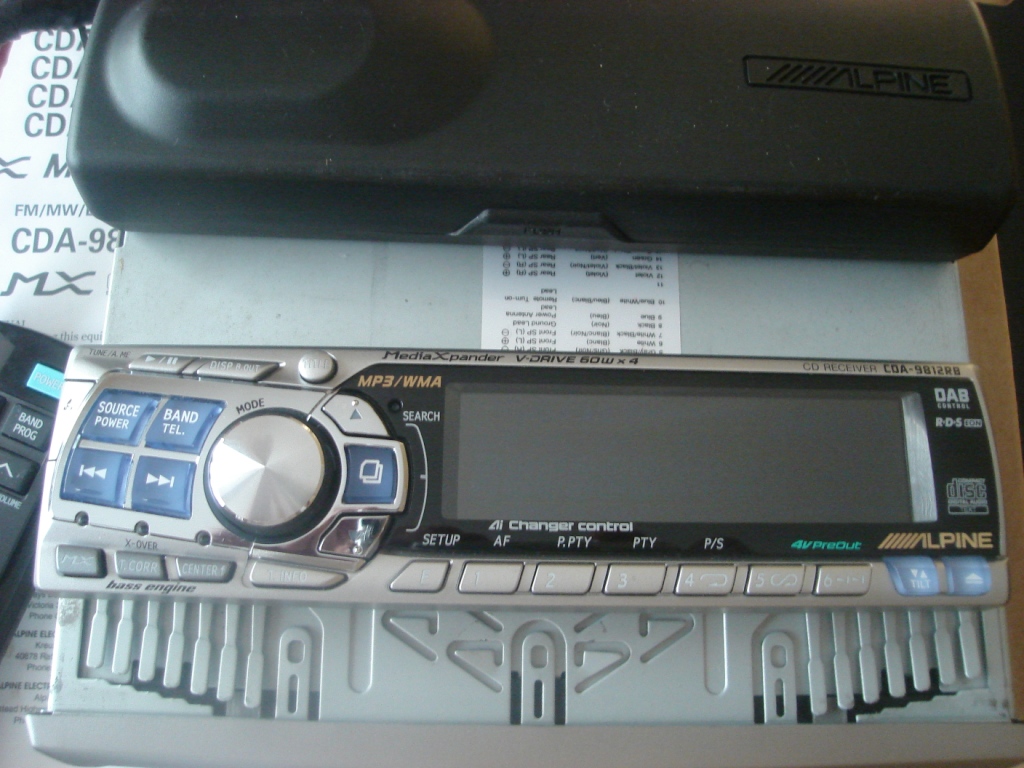 Alpine CDA 9812RB, как новый, есть пару мелких царапин на рамке, полный комплект: голова, шахта, рамка, пульт,футляр , провода, инструкция,оригинальная коробка, работает без проблем, диски читает нормально, панель работает нормально.