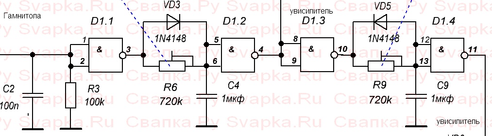 Мелкосхема К 561 ТЛ 1 ,R6- задержка на включения, R9 задержка на отключения. Кто хочет и то и другое выводы мелкосхемы 4,8,9, и 11 развязываем диодами и кидаем на одну нагрузку должно получится. R6-С4 и R9-С9 время задающие элементы.