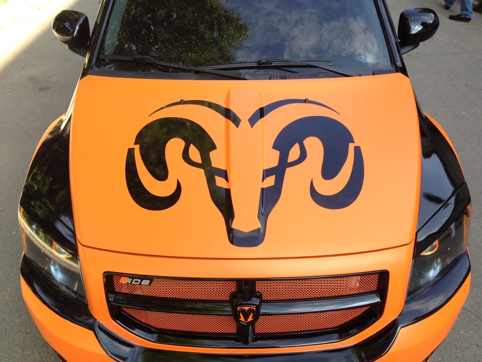 Работа над Dodge Caliber. Полная оклейка в оранжевый мат счерным, глянцевым стайлингом. Переделка переднего бампера и решетки радиатора. 4х этапная, порошковая покраска дисков VOSSEN. Покраска масок и установка би ксеноновых линз!