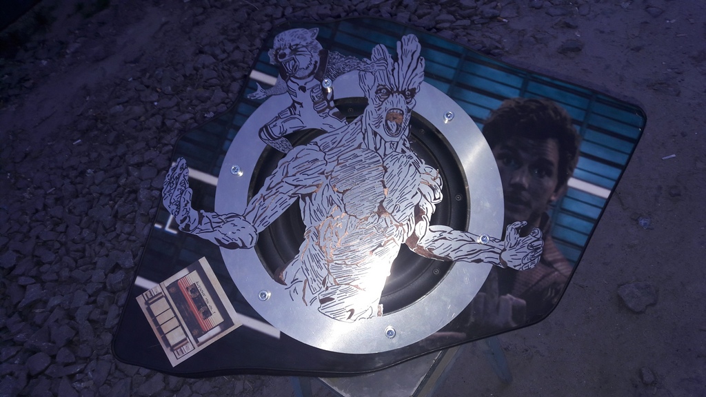 Делюсь своим очередным опытом. DISCLAIMER: Все персонажи и торговые марки, упомянутые в данном посте, принадлежат их правообладателям. Я не претендую ни на какое авторство. Пост и проект созданы в личных целях без какой-либо коммерческой выгоды. Итак, старенький Seat Cordoba 94 года. Вообще-то это машина тестя, и приехала она в Харьков из Краматорска совсем не для музыкального тюнинга. Надо было капиталить мотор. Естесственно, пожилой человек уже с трудом осилит такой ремонт самостоятельнj, вот я решил сдлеать ему такой презент. Мотор мы сделали, и мне стало скучно. Без ведома тестя, я решил немного попрактиковать свое хобби. Находясь под впечатлением от недавнего просмотра «Стражей галактики», а также от прослушивания саундтрека к фильму (а он очень достойный) , я решил создать саб в тематике «Стражей». Как обычно, размещение саба - в боковой нише багажника. Решил попробовать создать корпус stealth при помощи сендвича из деревянных панелей. Начал вырезать понемногу и накладывать панели друг на друга Собрал основную скорлупу, стянул, склеил, загерметизировал Скриншот из фильма я распечатал на самоклейке типа «Оракал». Это декор для лицевой панели саба. Вырезал лицевую панель и место под терминалы Обрабатывал внешнюю поверхность саба лепестковыми кругами, шпаклевал, шлифовал, лакировал, шкурил. Долго и муторно Примерил динамик, опорное кольцо, решетку-гриль Гравировка на решетке выглядела очень блекло и тускло. Добавил контраста Обтянул корпус карпетом. Немного накосячил со швами карпета, но это тыльная сторона, не смертельно Смонтировал лицевую панель, выровнял ее поверхность Поклеил декоративную пленку со скриншотом из фильма на лицевую панель |
