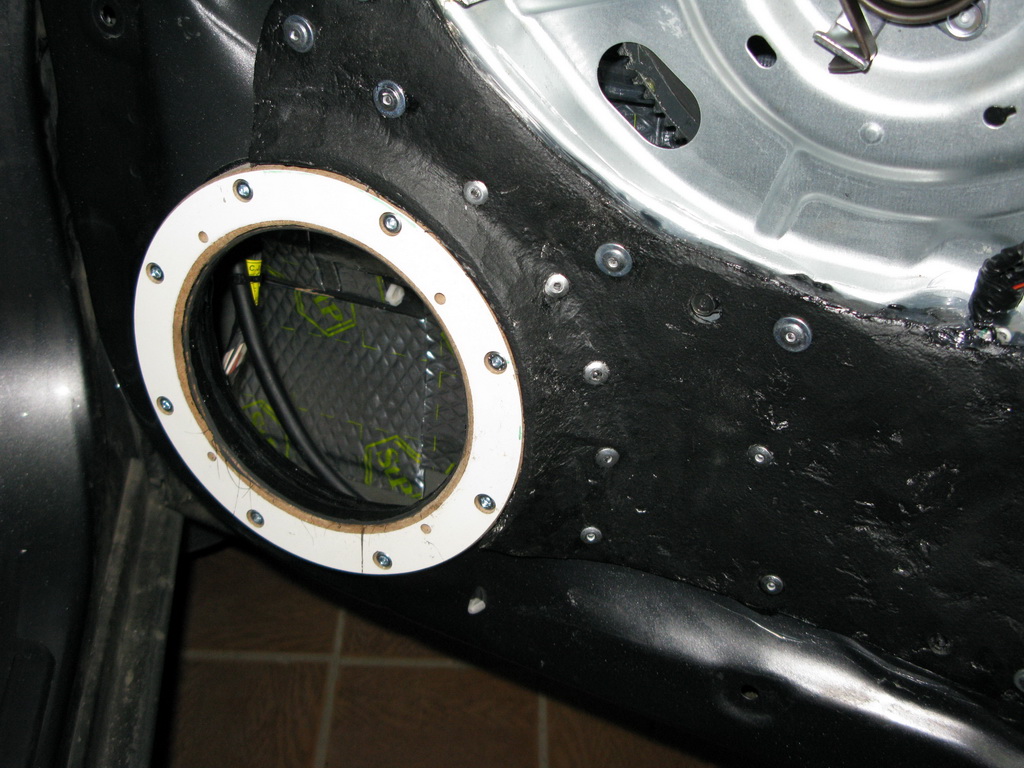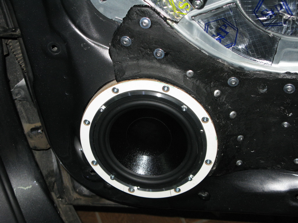Как человек, близкий к автомобилям и посмотревий их изнутри, могу констатировать, что двери Тушкана, неплохо задуманы. Инжиниринг не хуже, чем в том же БМВ. Понятно, что машина изначально более дешевая, но это ей на пользу. Нет заумных материалов, типа обивок из вторсырья, а чтобы разобрать дверь, нет необходимости держать рядом целый запас инструментов: все разбирается при помощи крестообразной отвертки и шила. Внутренняя панель двери, сделана из металлов двух толщин. Линия стыковки листов, проходит в месте установки штатного мида. Это однозначно добавляет жесткости конструкции, ну а вот то, что идет дальше, это уже плохо: панель, на которой смонтирован механизм стеклоподъемника, крепится к двери в нескольких точках и имеет недостаточную жесткость. При опускании/поднятии стекла в крайние положения, панель изгибается с диапазоном около 4мм. Изначально, были закуплены Т-образные алюминивые профили, уголки и набор для вклейки стекол. В общем, от слов к делу: Вот что мы видим, разбирая дверь: Сняв лишнее, видим: На внешней панели, нанесено полимерное покрытие прежде всего нужное для придания устойчивого положения металлу. Это однозачно лучше, чем местами отслоившаяся виброизоляция на БМВ, сделанная из материала, пахнущего канифолью и очень трудноудаляемого. Профили клеил не на метал непосредственно, а на Визомат МП, нанесенный в горячем состоянии. Решил приклеить по одному профилю сверху и при помощи уголков, связать трубу усилителя с внешней панелью. По мере выполнения работ, производил постукивания по панели, дабы выявить слабые места, производящие паразитные звуки. В итоге, получется, что внешняя панель обклеена сначала Визомат МП, далее Вибропласт Голд и местами Силвер. При поклейке, особое внимание обращалось на места возможного скопления воды. После подготовки, калитки стали ощутимо тяжелее. Благо, на этих машинах, петли меняются без особых проблем .Панель, на которой закреплен механизм стеклоподъемника, также обклеил с двух сторон Голдом. Добавлено через 43 минуты Для того, чтобы качественно установить динамики, понятное дело, нужны надежные опорные поверхности. Я ничего не имею против традиционного лобзика, но ведь на дворе 21век, поэтому, сделал векторные макеты колец и отдал МДФ на обработке на станке с ЧПУ. Получились такие заготовки: Далее, довел их до ума. Вот готовые детали для подиумов НЧ: Подиум формируется двумя кольцами, соединенными между собой болтами. Между ними - металл двери. Соответственно, имеем внутреннее и внешнее кольца. Внутреннее, пропитано многими слоями краски, для придания водотталкивающих свойств. При монтаже на дверь, прилегающие плоскости деталей, промазываются полиуретановым герметиком и намертво стягиваются болтами. После высыхания клея, проверка плоскостности подиума, поскольку, как я говорил, в том месте проходит граница соединения металлов разных толщин (это видно на фото). В моем случае, геометрия практически не пострадала. Вариант усиления, который сделал Олег Самонов, несоменно, лучший и однозначно подходящий для повторения, но для меня был немаловажный фактор - временной: машина уже месяц стояла в гараже, поскольку список переделок не ограничивался только "музыкой". А ещё, я побывал вот где: Это джазовый фестиваль в Коктебеле. Накупил дисков, в том числе лично у Анны-Марии Йопек, которую оч
