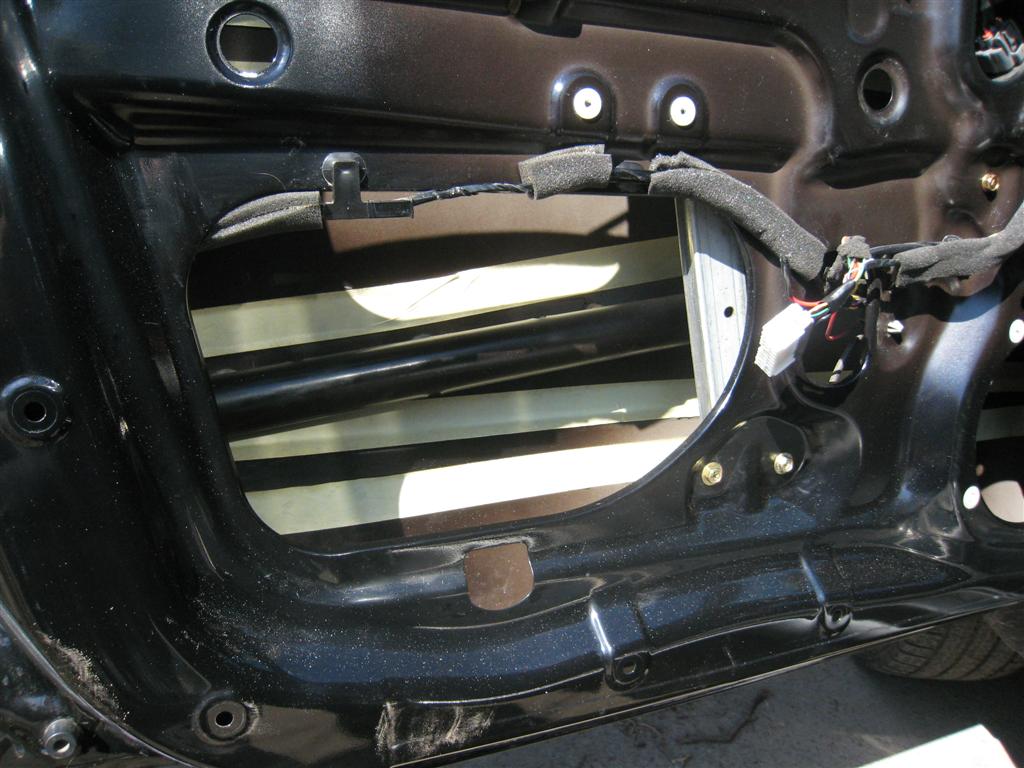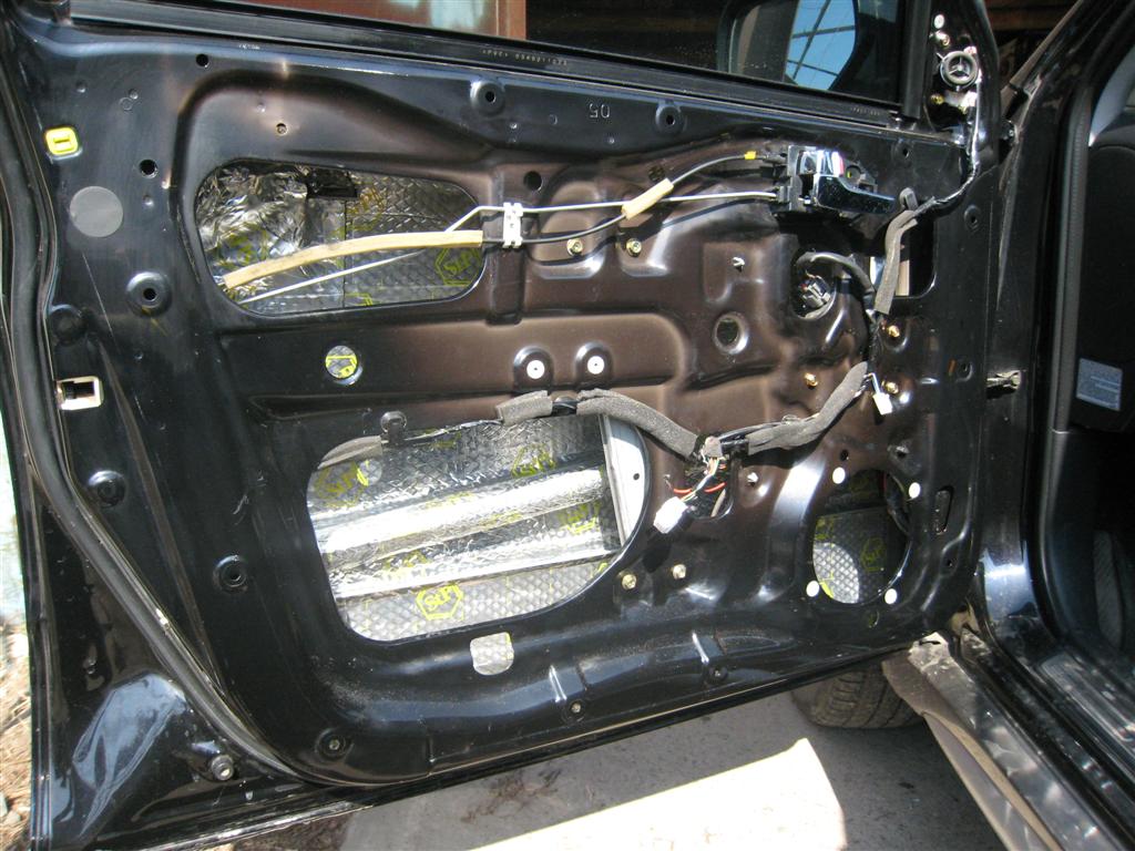Построение системы начал с подготовки передних дверей. Метал в Ауте на удивление прочный и потолще, чем у большинства современных машин! Может это потому, что это мой первый кроссовер. Просто в работе нет ощущения, что работаещь с фольгой. В своей работе, многое перенял из работ Олега Самонова, за что ему огромное спасибо. Двери мылись, потом на стекольный герметик с использованием праймера устанавливались алюминивые уголки для придания жесткости наружной филенке двери (по три на каждую дверь). Технологические отверстия в дверях на Ауте намного меньше, чем на Туксоне. Это конечно с одной стороды плюс (жесткость конструкции), но и минус – сложно просунуть почти метровый уголок с намазанным герметиком. Но если не спешить, даже руки растущие из одного известного места справятся с поставленной задачей!