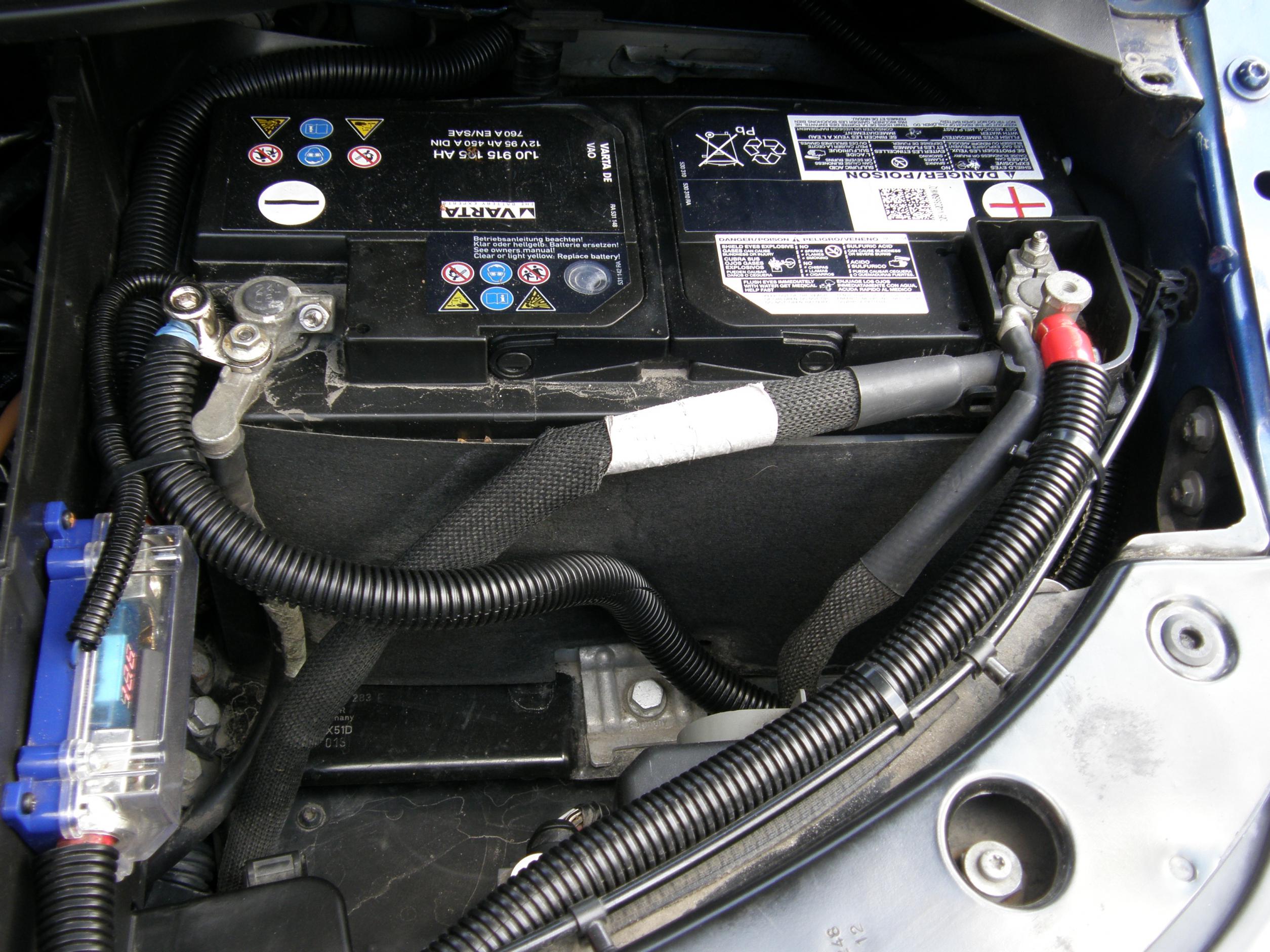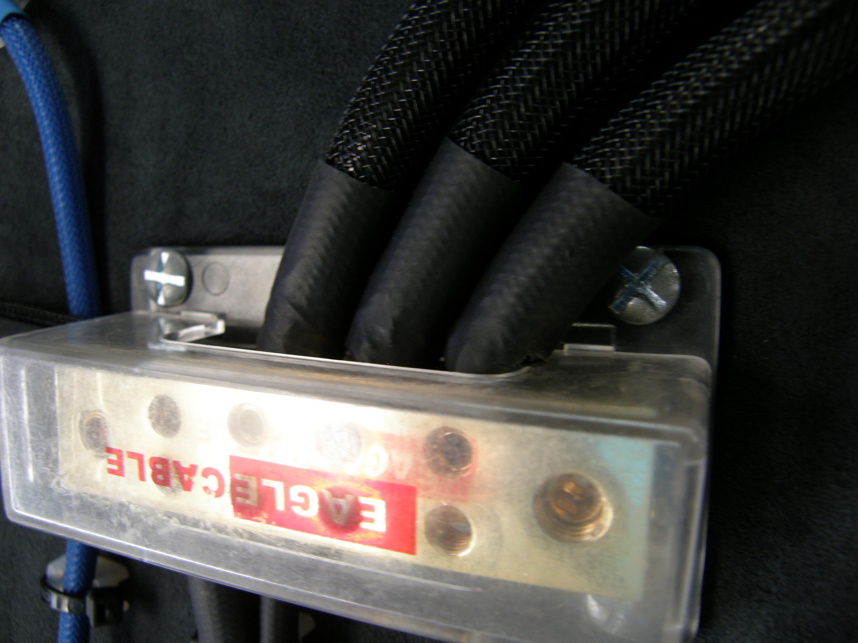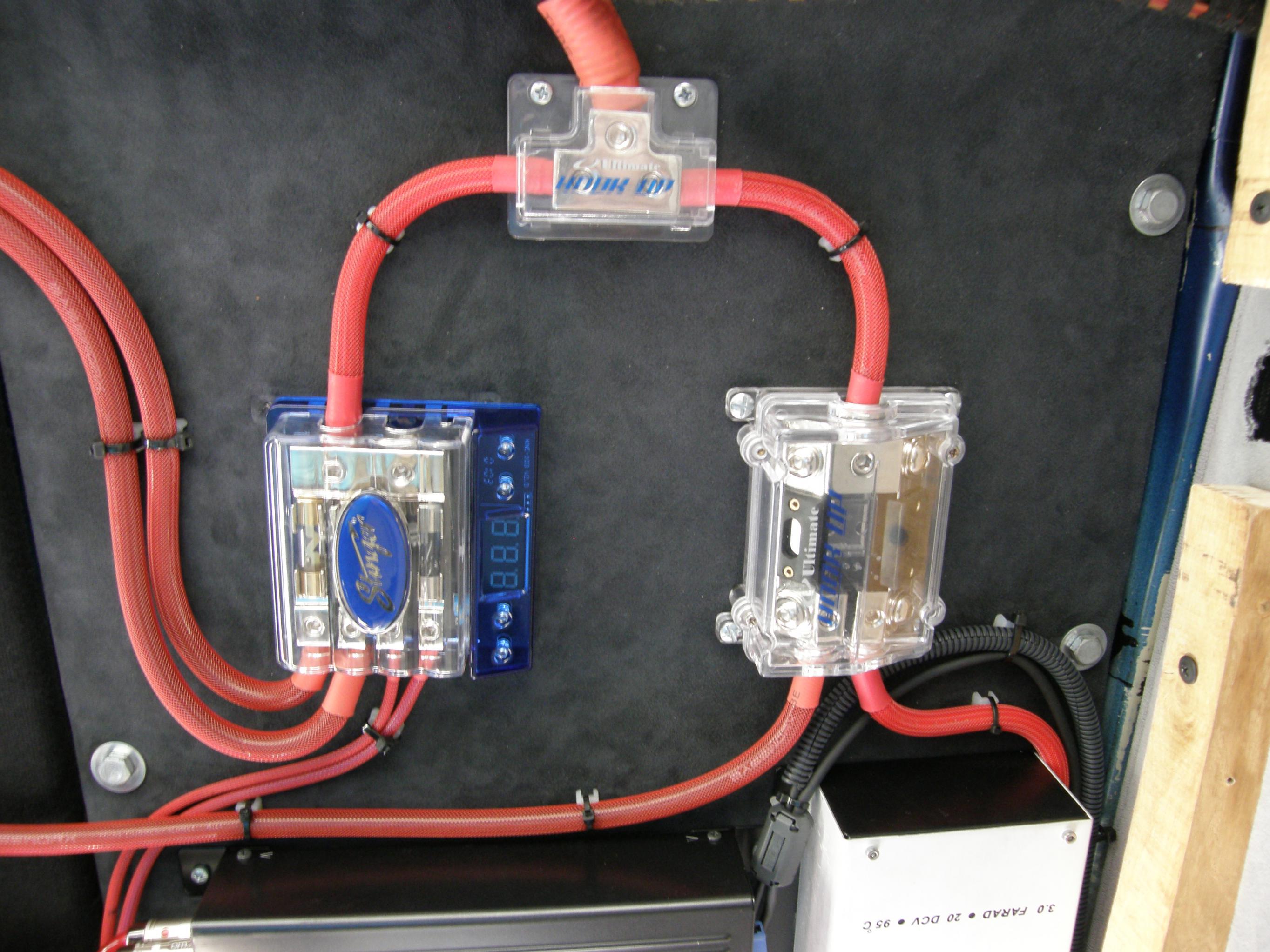 Силовая проводка организована следующим образом: от плюсовой клеммы штатной батареи автомобиля до главного предохранителя и от него до дистрибьютора применен провод сечением 50 кв. мм(0 Ga) фирмы Ultimate из установочного набора HU-PK0. Таким же сечением продублирована минусовая перемычка от клеммы аккумулятора на кузов. Также «нолевым» калибром выполнен монтаж из кузова на дистрибьютор массы.