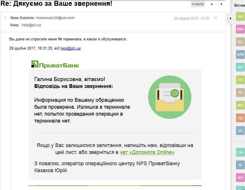 и службы безопасности ПриватБанка Лопатюк Галина Борисовна г. Первомайск, Николаевская обл. +38 098 798 3803 ivanmusic58@ukr.net 27.12.2017г., около 14 ч. 30 мин., терминал Приват Банка в магазине «Везунчик» ул. Коротченко 1, г. Первомайск Николаевская обл. принял вносимые моим мужем Лопатюк Иваном Владимировичем наличные в сумме 3700 грн. (три тысячи семьсот грн.), но не перевел их на мою приват карточку — завис (не нажималась кнопочка-транспорант «Перевести»). Проводимые действия на терминале: - пополнить карточку – вставить карточку (получил ее назад) - внесение купюр (при этом на дисплее высветились мои ФИО – Лопатюк Галина Борисовна, группы цифр номера карточки, с внесением денег увеличивалась отображаемая сумма внесенных денег.) Муж довольно длительное время вносил деньги (значительная сумма, да еще некоторые купюры сначала не принимались, а потом были приняты терминалом), - затем многократно, и без должного результата, нажимал зависшую кнопку «Перевести», - многократно нажимал кнопку «Так» на дисплее, в ответ на вопрос терминала «Вы еще здесь?» Таким образом ТСО работал в штатном режиме, не удавалось только перевести внесенную сумму. - подходили свидетели, смотрели на сумму перевода. Муж отходил от терминала на несколько десятков секунд, спрашивал у продавцов магазина «Ласунчик», что делать, куда звонить-кого вызывать, на что те ответили, что подобное здесь часто случается, № 3700 назвали мгновенно, возвратился и продолжал сохранять информацию на табло ТСО. - так же делал фото дисплея зависшего ТСО, под разными углами обзора, что бы были видны отражения и отблики от внешней обстановки (см. фото), - несколько раз дозванивался на «Горячую линию» № 3700 не отходя от ТСО, - в разговоре с оператором 3700 (не отходя от ТСО) указывал, что не хочет отходить от терминала, так как на дисплее сохранилась вся информация о неудавшемся пополнении приваткарточки на сумму 3700 грн., на что оператор горячей линии ПриватБанка 3700 ответил, что мой муж уже длительное время стоит перед ТСО, длительное время нажимает кнопку «так» в ответ на запрос «Вы еще здесь?», пытаясь сохранить информацию о неудачном пополнении карточки. Оператор гарячей линии Приватбанка 3700 настоял на передаче трубки мне, как оказалось всего лишь для моей идентификации, а не для помощи в разрешении ситуации (я в это время находилась в автомобиле, рядом с магазином «Ласунчик»). Своими действиями оператор 3700 создал у нас уверенность, что ситуация под контролем, он все видит, и проблем с возвратом денег не будет. Каковы же были наше удивление, гнев! когда через сутки нам пришла СМС с отказом в возврате денег: "Излишка в терминале нет, попыток проведения операции в терминале нет." Это ваши специалисты провели проверку терминала, даже НЕ УТОЧНИВ № ТСО и в каком именно магазине «Везунчик» в г. Первомайск он установлен! Если же терминал определен посредством технического мониторинга, значит подтвержден факт приема ТСО денег и некорректной его работы! Нас что – за дураков принимают? Вы еще скажите, что случившееся - это сон, нам приснилось!… Таким образом получается, что - некоторые ТСО «ПриватБанка» внешне – в исправном и рабочем состоянии - на самом деле могут быть или неисправными, или преднамеренно настроены только на прием денег, без перевода денег на карточки клиентов, - некоторые операторы «гарячих линий ПриватБанка»