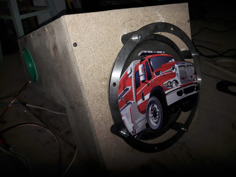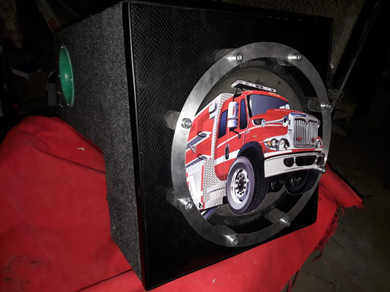 Мой приятель, сосед по гаражу, как оказалось, тоже неровно дышит к автозвуку и слезно попросил меня сделать ему саб в Волгу. За пенный напиток, в течение нескольких теплых вечеров в гараже поделка появилась на свет. Парень работает спасателем, поэтому я захотел оформить саб в соответствии с его профессией. Мы нашли прикольную картинку пожарной машины (правда, не нашей, а американской) и реализовали ее в решетке гриль. Он приобрел 10-дюмовый Machete, и исходя из его характеристик, стали пилить короб. Нарезали черновые панели короба. Долго мучались с размерами, только третья версия короба нас устроила Приятель очень хотел фазик. Я до этого его еще не делал, но почему бы не попробовать? Сделал болванку для раскрыва трубы ПВХ, растянул саму трубу феном К этому моменту решетка гриль была готова, примерили ее на короб Поклеили карпет Смонитровали фазик и терминалы. Цвет фазика мне понравился, ярко смотрится ) На фронт поклеили кожзам а ля «змеиная шкура», кант фронта задекорировали мебельным кантом Все собрали: |