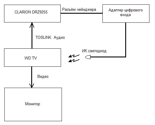 Теперь владельцы Clarion могут управлять мультимедийным проигрывателем WD TV с панели Clarion. Адаптер имеет выход на инфракрасный светодиод. Расположите этот светодиод в зоне видимости передней панели мультимедийного плеера WD TV. При нажатии кнопок передней панели Clarion эмулируются нажатия на кнопки пульта ДУ мультимедийного проигрывателя.