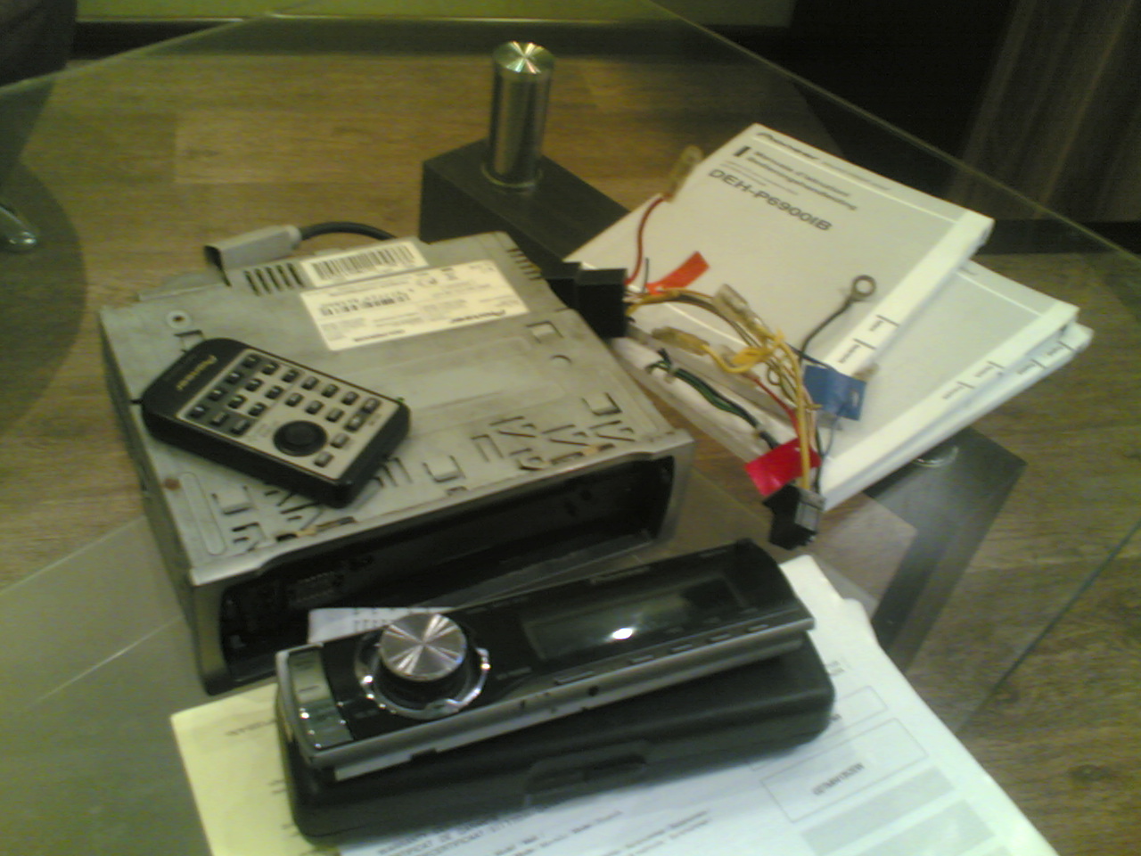 Продам Pioneer DEH-6900IB. Состояние на 4. Потерта немного крутилка, чуть сдерта панелька снизу (на фото видно), отломаны пара крепежей рамки, поэтому я ее просто преклееил к корпусу. Полный комплект. Коробка, всевозможные бумажки, пульт, чехол для панельки.