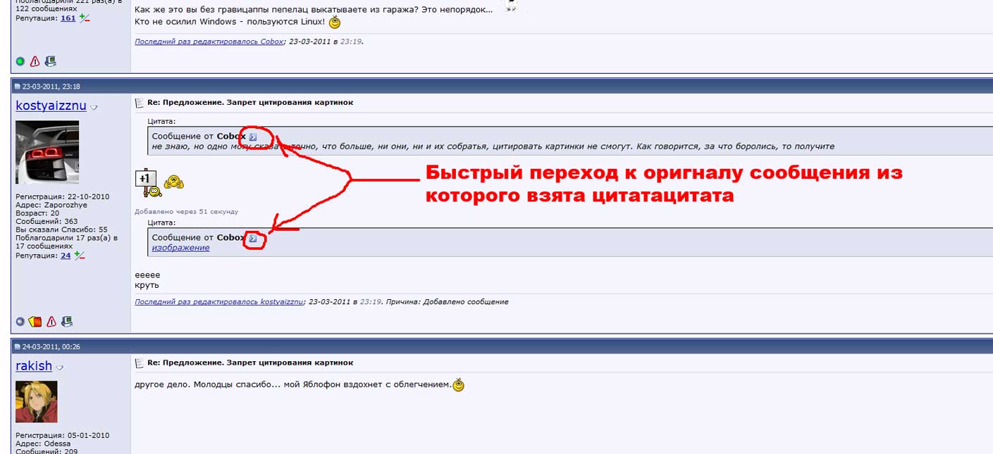 Запретить цитировать ИЗОБРАЖЕНИЯ как вложенные так и гиперссылочные. т.е. при цитировании пользователем какого либо сообщения содержащего изображение, в цитате отображается не изображение целиком а только лишь ссылка на него. что это даст? экономия трафика, при пользовании форума с мобильных устройств которые не сохраняют во временные папки изображения, в частности Iphone. экономия ресурсов компутера, если оный довольно слабый типа НЕТБУК. экономия пространства экрана, не придется мотать километры мышью что б добраться до конца страницы при этом бегло прочитав посты. уменьшения засранности темы одинаковыми изображениями. |