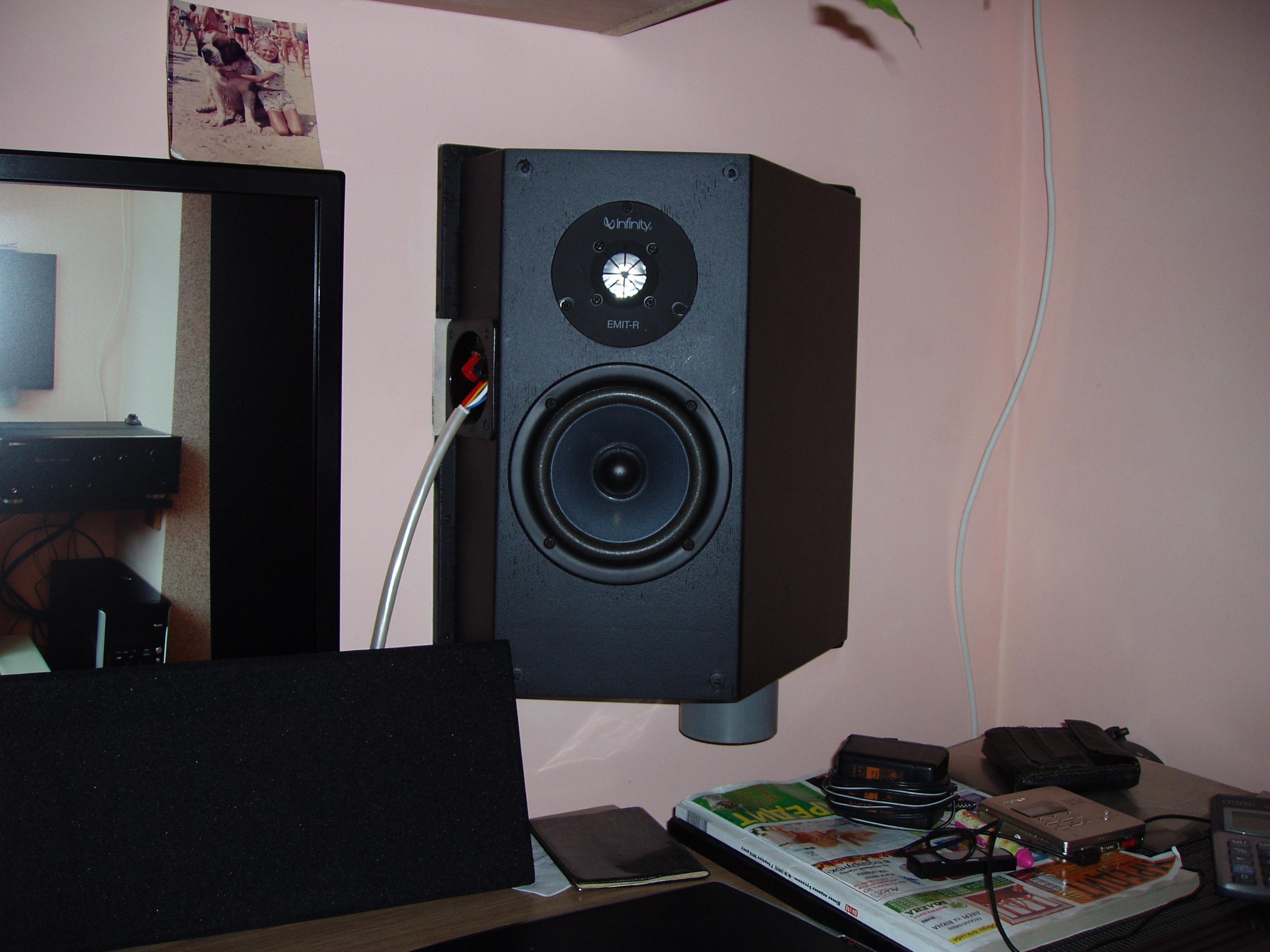 А вот и обещанная мною вчера система. Краткое описание. Компютерная система SaNyCo XE-01 (2+1) была куплена лет 5-6 назад и некоторое время экспуатировалась как есть, но ручки-то чешутся чегой-то усовершенстовать. Так как прошлые усовершенствования были несущественными, я их упоминать не буду. Суть настоящего усовершенствования - середи кучи б/ушных 10см мерседесовских широкополосных динамиков (Спасибо Малхазу!) была найдена пара хороших и встроена в пластмассовую фасонину диаметром 10см (колено и переходники) и 5см (труба). Для фиксации к столу использованы оригинальные крепежи для канализационных труб. Динамики вклеены (термоклей) в фанерные кольца, а те уже привинчены внешними саморезами. Дополнительно герметизированы термоклеем по кругу. За динамиками рыхло размещен синтипон. Тонкая труба, она же кронштейн, она же фазонтертор пуста и снизу открыта, ее длина 110см. Акустический провод сечением 2х1,5 кв.мм. Sommer cable куплен в магазине музыкальных инструментов и припаян напрямую к плате усилителя с одной стороны и запрессован в латунные "мамки" с другой. Как все закреплено видно на фото. Ширина стереобазы 1300мм.