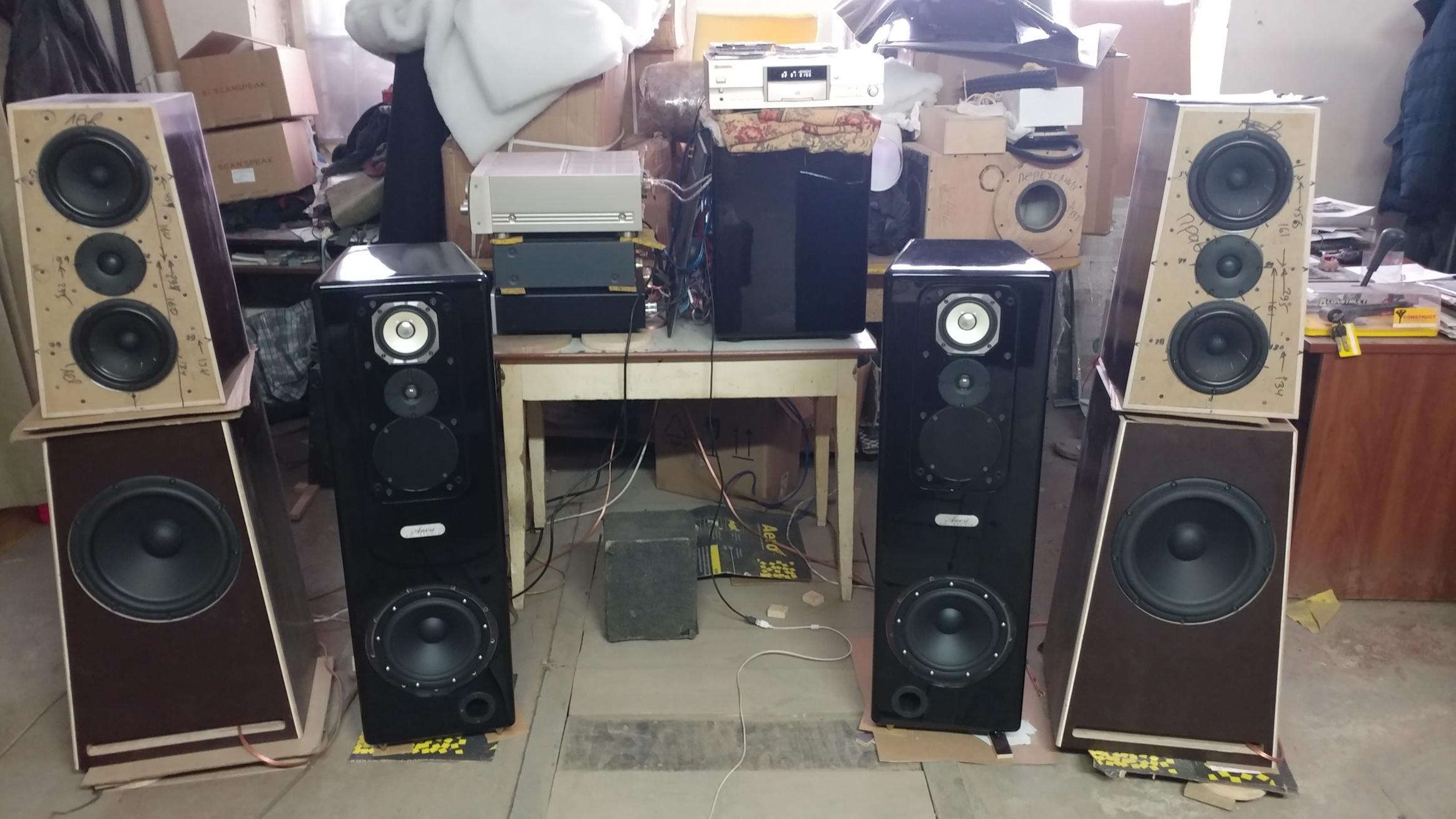 С прослушкой закончили, практически все замечания и восторги совпали с нашими ощущениями, это хорошо, теперь надо исправлять...Переходим к обсуждению завершения конструкции АС, отделки, схемотехники системы с заказчиком... Параллельно собрали нашу ДЕМО акустику с новыми головками, пока в черновом варианте, бегло прослушали: хорошее впечатление, как и ожидалось , ЗАМЕТНО лучше звучит, чем в старом варианте, но есть над чем работать....будем подстраивать и слушать... В спешке забыли размять басовики((( Невольно сравниваем со звучанием Пирамиды ( уссловно назвал АС клиента)))... Та звучит лучше! и по мощи, и по тоналке, и по сцене.... Может неудачно стоит наша ДЕМО?? |