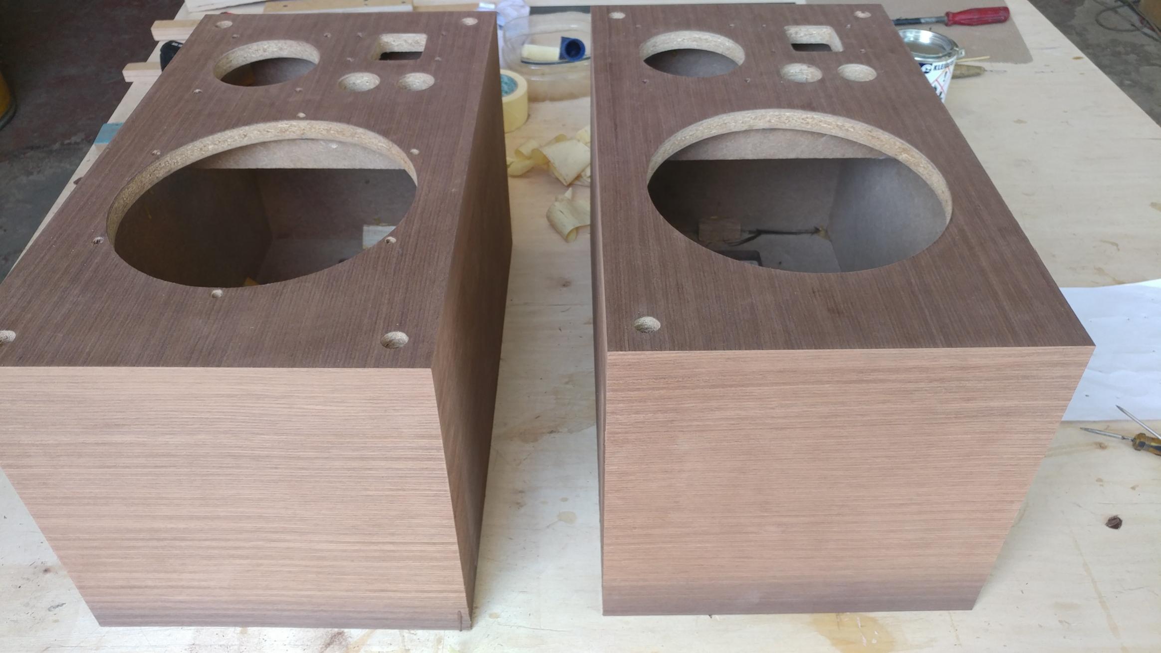 Закончили покраску всех деталей...под черным лаком.. и 3-х слойное покрытие шпонированных деталей...Мда....порода дерева шикарная..очень симпатично выходит и КАЧЕСТВЕННО!!! Но приняли решение еще пару слоев нанести....для шика!))) Внешний акустики должен соответствовать качеству ее звучания! Пока планируем поканальное усиление с активными кроссами ...прослушаем и примем решение...
