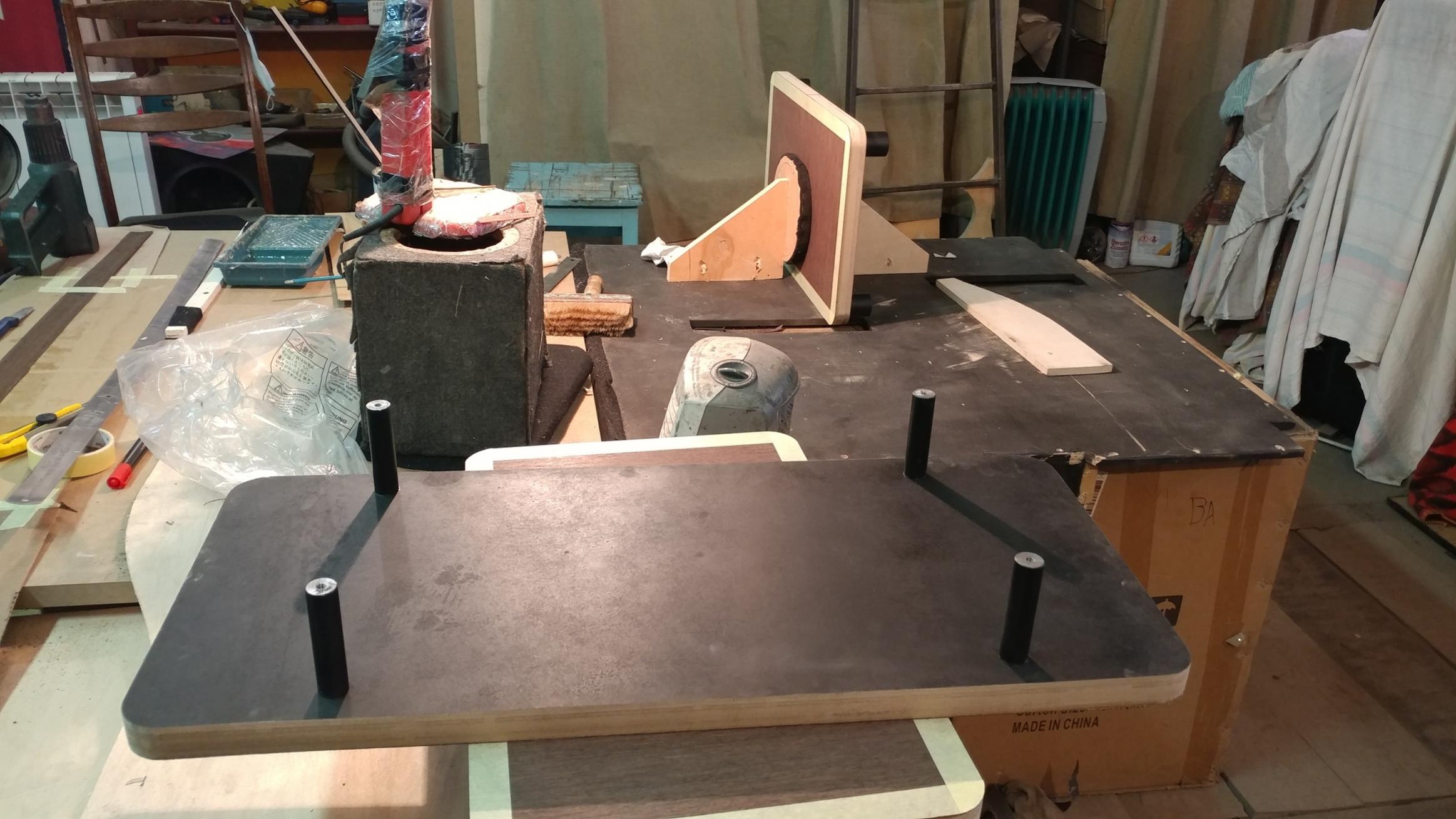 И опять пауза перед следующим авто...Немедленно используем ее для завершения шпонирования поверхностей и торцов панелей. Примеряли опорные конусы...все хорошо. Далее шлифовка, покрытие многослойное и полировка....