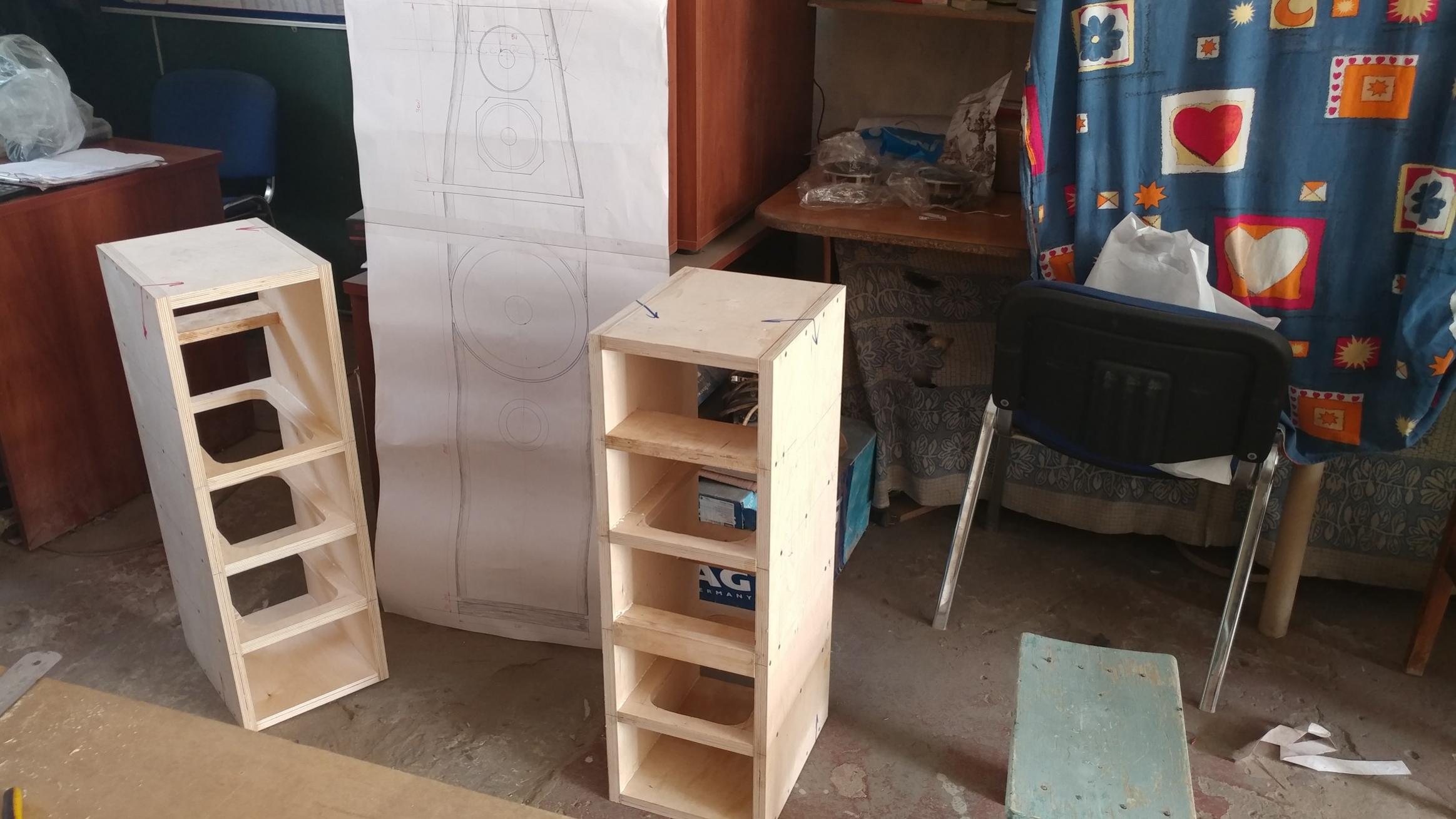 Помимо оптимизации старых проектов ( снижение себестоимости, улучшение качества звучания и др), начинаем новый проект..пока условно назовем New AC... пасс кроссы, 3-х полосная, учитываем старые успешные наработки.... Заготовки уже нарезаны, фанера 21мм, начато изготовление обьемов для НЧ динамиков...Варианты с головками будут опробованы разные, будут изготовлены корпуса в черновом варианте , без отделки, т.е для демонстрации клиентам качества звучания.... Нам это просто интересно))))