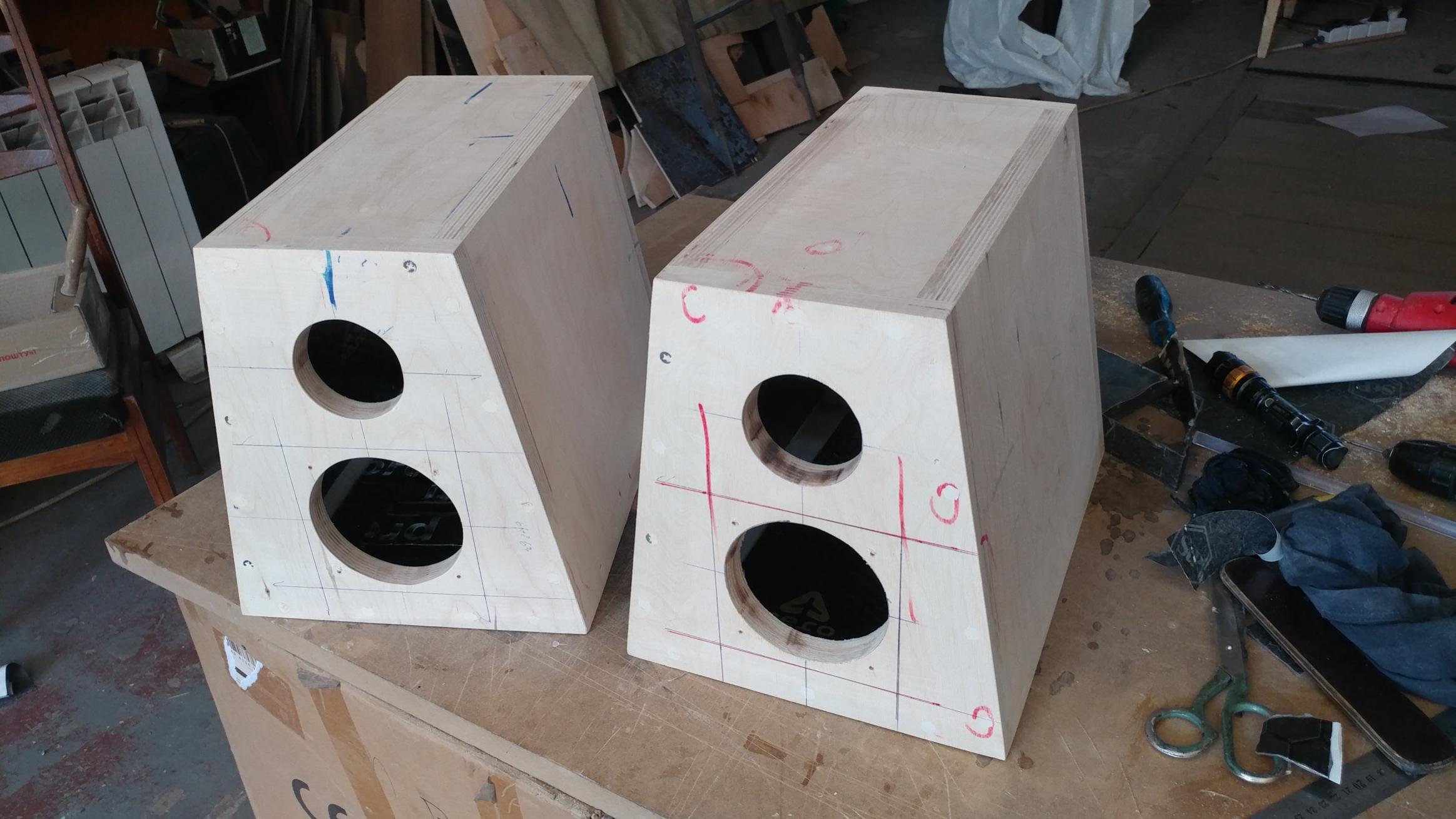 Итак, нанесли виброизоляцию на стенки корпусов НЧ и СЧ/ВЧ, отшлифовали поверхности под шпонирование ( но пока это делать не будем.. .для тестирования, настройки и прослушивания вполне достаточное оформление). Также пока не будем изготавливать лицевые панели для корпусов....это все потом...после получения и окончательного выбора акустики.....