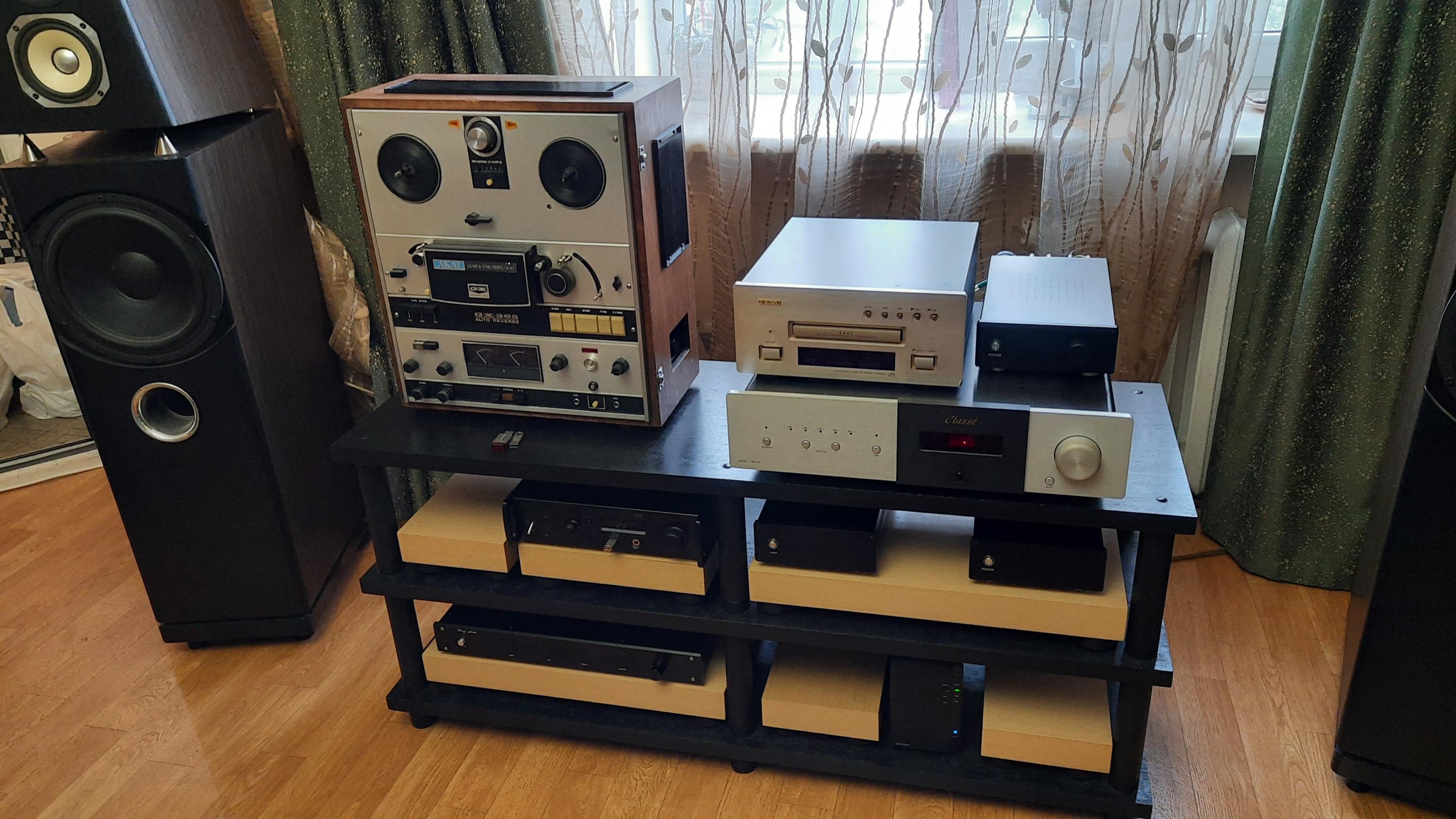 Предоставилась возможность вспомнить молодость )))) послушать звучание полупрофессионального катушечника Akai GX-385...Аппарату желательна квалифицированная профилактика , но он и сейчас в рабочем состоянии... Звучание...хорошее, приятное даже на скорости 9,5 см/сек..только слегка валится самый верх... На излишне резких композициях это даже делает звук более комфортным....На скорости 19,5 см/сек все сразу выправляется в ВЧ диапазоне и он воспроизводит до 25000Гц..но все же требуется небольшая корректировка , подстройка всего диапазона вцелом..током подмагничивания. Несмотря на возраст, чувствуется потенциал и основательность аппарата, да и головки, стойки, ролики в очень хорошем состоянии... Вполне можно донастроить, сделать требуемую профилактику...Даже прикидывал, а не оставить ли себе..для воспоминаний и антуража. НО! У меня на сетевом проигрывателе нет аналогового входа, следовательно нечем регулировать общую громкость системы..А приобретать сейчас предвар....ну не время....)))