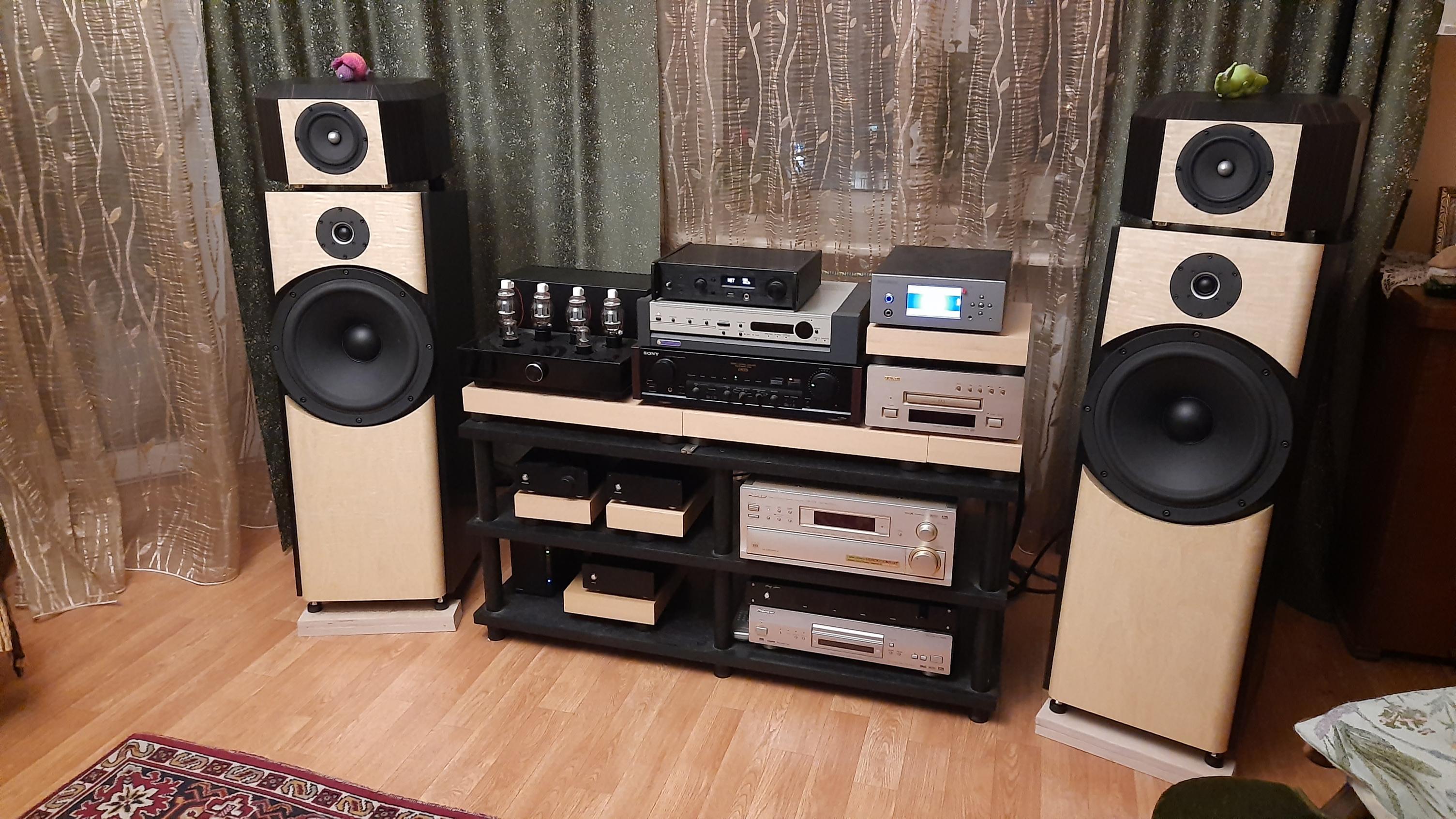 Несколько раз пытался собрать / создать систему для себя любимого ... И вот в очередной раз)))) ………Считаю самым ВАЖНЫМ звеном в аудиосистеме…акустику, поэтому с большим энтузиазмом и желанием спроектировали и изготовили 2 проекта АС : оба в варианте bi-amping , оба на пасскроссах. Первый …. полностью разработанный , спроектированный нами, условное наименование Tower. ВЧ – топовый бериллиевый Satory, CЧ – 5-ти дюймовый Fostex, НЧ – 10-дюймовый SS Discovery в фазоинвертном оформлении. Пасскроссы с использованием индуктивностей собственного изготовления, конденсаторов Clarity Cap ESA и Monacor. Второй…по мотивам известного проекта Троэлса. Ну, здесь все круче..конденсаторы Jantzen Audio Superior Z-Cap, ВЧ и СЧ из топовых головок Seas, НЧ блок с использованием 12-дюймового SB Acoustic и электронного блока с ЭМОС . Оба варианта АС звучат очень хорошо…а при прослушивании и сравнении выяснилось…двигаюсь по восходящей! Второй проект заметно лучше звучит ( стало понятно, какие коррективы надо вносить в первый проект )) и меня очень радует. Теперь буду слушать системы коллег…изучать, сравнивать, делать выводы.