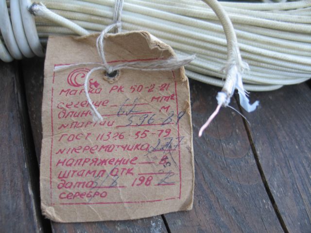 Снаружи ткань в лаковой пропитке, под ней фторопластовая обмотка, посеребреный экран, посеребреная жила ф1,2, фторопластовая изоляция между жилой и оплеткой. |
