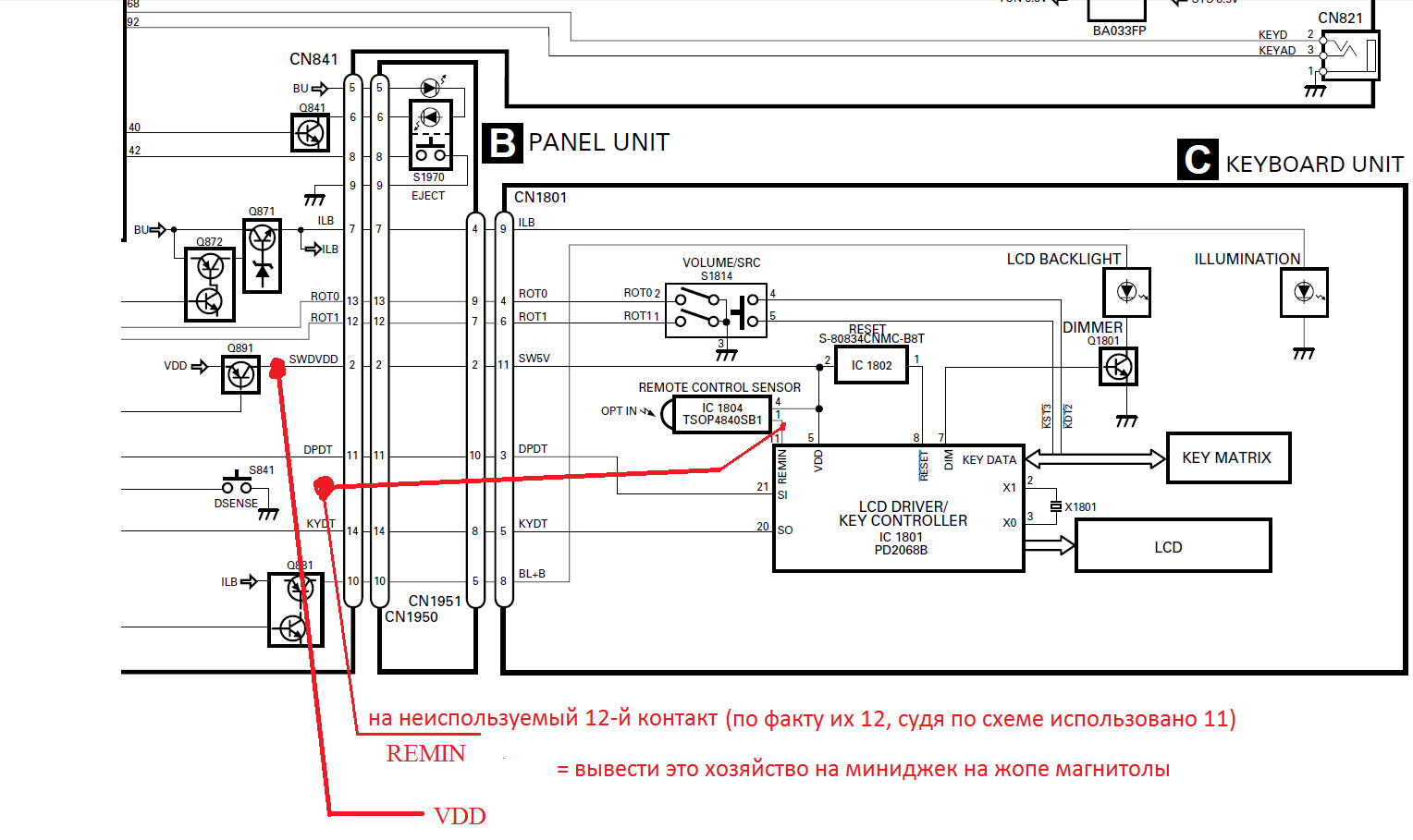 Дело в следующем, ннада вынести ик-приемник из 77-го пиона (или параллельно повесить другой в районе руля). Между ГУ и мордой есть 12 контактов и, похоже, использовано только 11. Реально? |