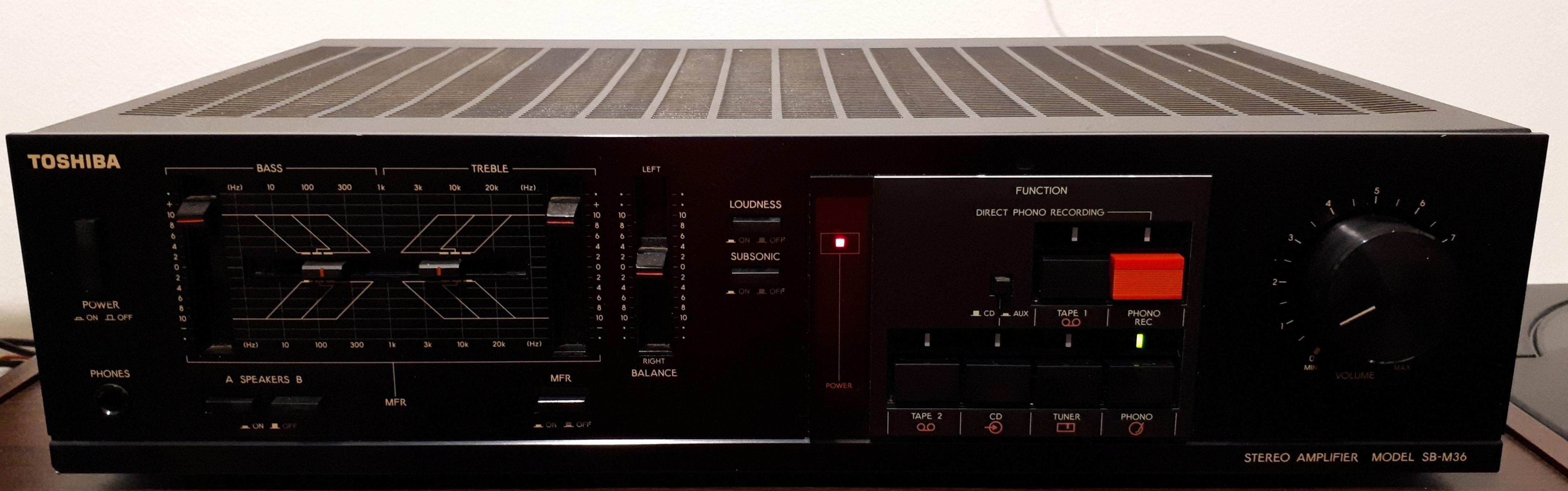 Транзисторный японский усилитель с параметрическим отключаемым эквалайзером, что позволяет регулировать тональный баланс в заданных пределах не на фиксированной, а на выбранной частоте (частотах) по НЧ и ВЧ.