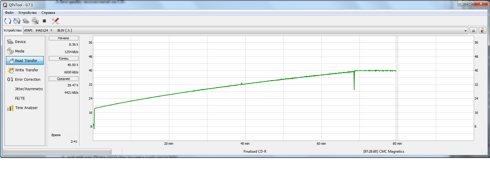 так как qpxtool глюкавит при отображении ошибок C1, решил попробовать Nero CD Speed. кардинальных отличий в результатах не выявлено, просто теперь правильно показаны ошибки. пожалуй, приложу картинку: 1. ImgBurn: С1=77/15.87 ( 2. Burrrn: С1=32/4.57 ( 3. EAC: С1=75/11.86 ( но тут стало интересно, а как изменятся ошибки если сменить скорость записи на минимально возможную для привода. в моем случае 8х. записал еще 2 болванки, гулять так гулять. 1. прожиг на 8х ( 2. прожиг на 16х ( для аудио диска лучше всего подойдет режим CLV (этот режим работает на скорости 4х 8х 16х, Constant Linear Velocity - постоянная линейная скорость - диск крутится с замедлением от центра к краю для достижения постоянной скорости) но учитывая увеличение скоростей записи и применение новых быстро реагирующих слоев в болванках лучше 16х. что и получилось на практике. соме интересное как воспринял мой капризный девайс записанное: прочиталось все записанные диски, кроме тех что записал Burrrn, хотя по всем законам физики он записан лучше. (меньше всего ошибок) скорее всего какие то вопросы с сервисной зоной, то ли не правильно пишет, то ли не по стандарту, etc. эвон оно как, оказывается. надеюсь, было познавательно. (: Последний раз редактировалось Fedosoff; 10.05.2011 в 21:19. |