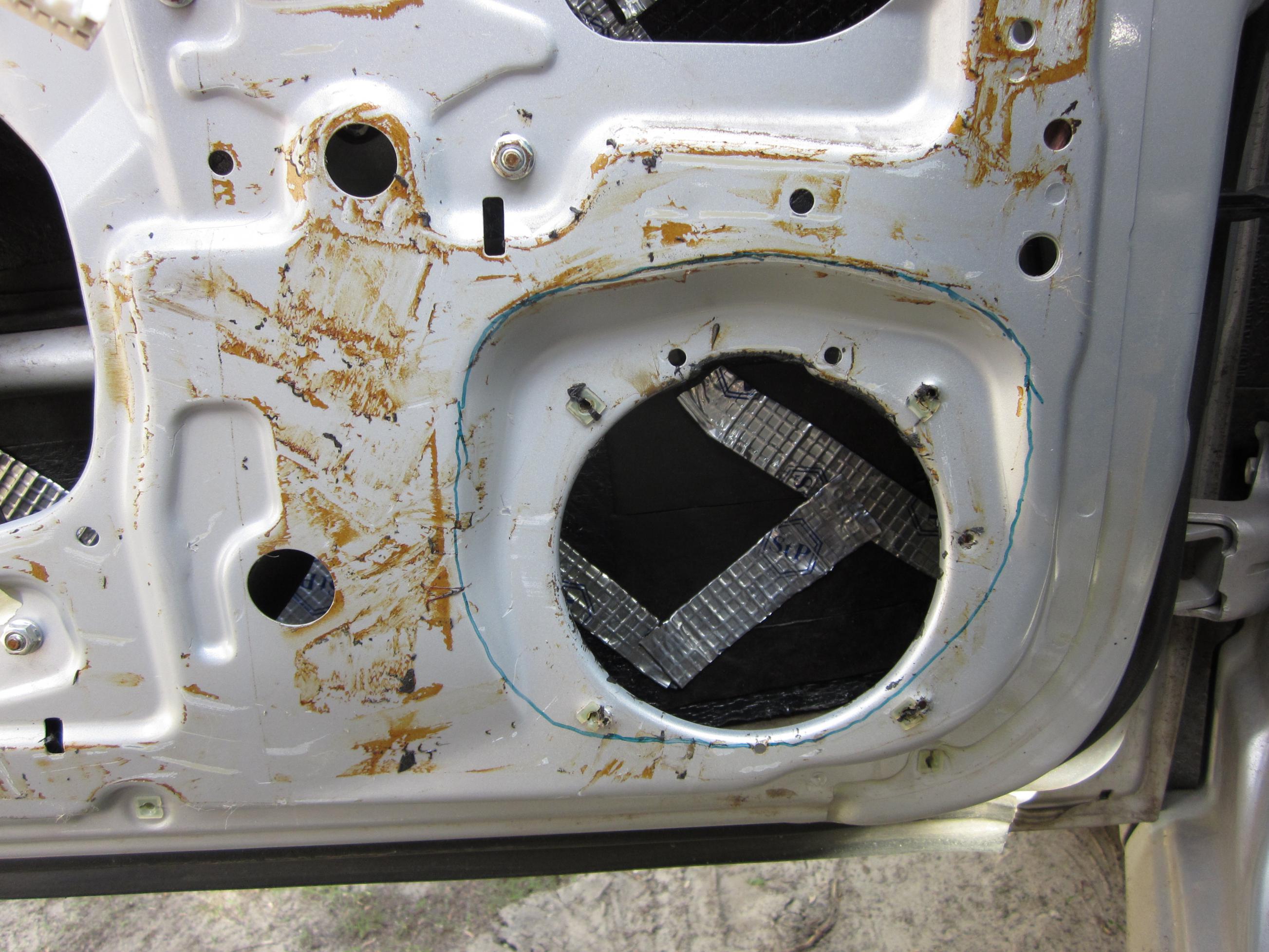 Подики под ВЧ готовы и ждуть перетяжки... Далее миды, тут интереснее, карты дверей Лачика созданы для того чтоб искоренять серединку впринципе))) на фотке видно, какой по сути должна быть сеточка и какой она является на самом деле, посему сетку долой, а на ее место уже человеческий подик. Далее тонель, в Лачике как и в многих других автомобилях он тут как тут, что опять-же плохо для той-же середины, выйти из ситуевины поможет балгарка(или лобзик) без них никак(на фото красным отмечена примерная линия обреза).